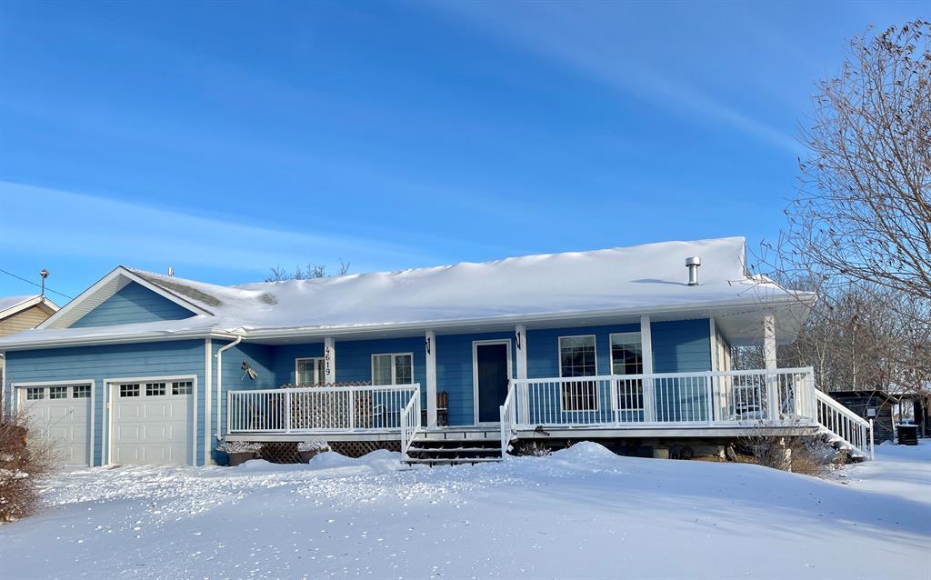 Priced To sell. Beautiful family home on the south edge of Mannville, which offers a perfect blend of quiet country living and convenient access to all the services of town. It is situated on a double lot that backs on to a green space, providing a peaceful and serene living environment. The open floor plan with a spacious kitchen and island that seamlessly flows into the dining area and living room. The living room boasts large south-facing windows that flood the space with natural light, creating a bright and inviting atmosphere. The gas stove adds to the ambiance and warmth of the room. The home is perfect for a growing family or those who are semi-retired, with four bedrooms, an office, a main floor laundry, and a large basement area. The basement and garage also have infloor heating, adding to the overall comfort of the home. The wrap-around veranda with a 6’ overhang is an ideal spot to enjoy the sunny summer days. The property also includes an adjoining double garage and a 2 bay shop with 10' high doors, providing ample storage space for an RV or project. The exterior of the property is beautifully landscaped with perennial beds and flowering shrubs and trees, creating a visually appealing and relaxing outdoor space. Mannville is an active community with a k-12 school, grocery and boutique shopping, a golf course, and easy access to major cities like Vermilion, Lloydminster, and Edmonton. This is a must-see property for anyone seeking a comfortable and serene, home.