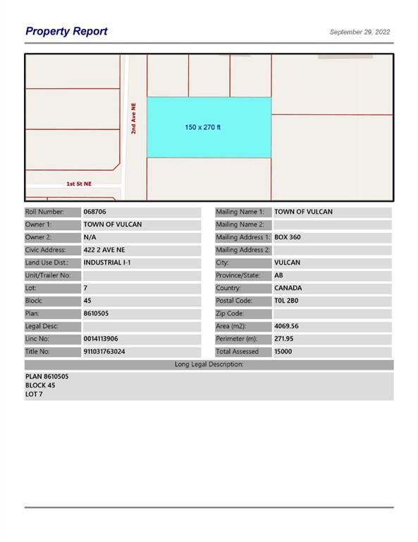 Industrial lot for sale in the Town of Vulcan Industrial Subdivision. Here is an opportunity to purchase one, or more industrial lots, at an affordable price to set up your business. Term of sale - within 12 months from the closing date, a development agreement is to be completed, and construction on the property shall commence within 12 months of the date of the execution of the development agreement.
