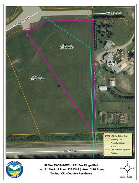 INTRODUCING FOX RIDGE ESTATES! - 121 Fox Ridge Blvd. (Plan 2221345 BLK 2 LOT 31) 2.7 Acres - Located west of Rocky Mountain House just off Old HWY 11A an easy 8-minute commute from town limits. Services (power, gas) are at the property line, and private well and septic systems are to be installed by the purchaser. Zoned COUNTRY RESIDENCE DISTRICT “CR”, with no building timeframes, (not intended for recreational use). Adjacent with the Ferrier community with amenities such as a community hall, outdoor rink, basketball court and playground. Close proximity to the North Saskatchewan River, Pine Hills Golf Course & Crimson / Twin Lakes. The location of this subdivision offers a perfect retreat from the hustle and bustle with amenities of town only minutes away. AWAITING YOUR DREAM HOME!