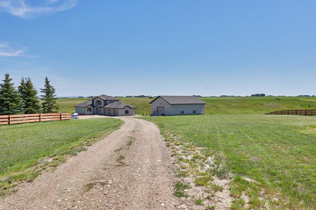 A quick drive to your scenic Valley Ridge Country Estates! Let's start with the property - there is enough space here to create your perfect oasis, all while enjoying the beautiful rolling hills of the countryside. The only limitation is your imagination! Let's take a tour, starting outside with the grand entrance, high archway and arched windows that are perfect accents. Step inside to a spacious entrance and beautiful hardwood floors that lead to a large hall closet and then through glass double doors into a great office space. Down the hall is a large family room and dining room, which connects to the spacious kitchen which has stainless steel appliances, pantry and a large island with stovetop, hood fan and seating. Also, on the main floor is a 2-piece bath and the laundry room has plenty of cabinets and countertops, with access to the triple car garage. Walk up the carpeted winding staircase with detailed metal spindles, and at the top you overlook the main entrance. The entire upper level hosts the master suite, where each room is abundant in size - the bedroom has plenty of windows, there's a 5-piece ensuite with a large tile shower, walk-in closet and access to a large balcony. The lower level is fully developed with a family room, theatre room(possibility to be a bedroom), 2-piece bath, storage room and a bedroom with walk-in closet and 4-piece ensuite. The attached triple garage and detached shop are both finished with in-floor heat. This stunning property has been well maintained and pride of ownership is evident, it has everything you have ever dreamed of. Call today!