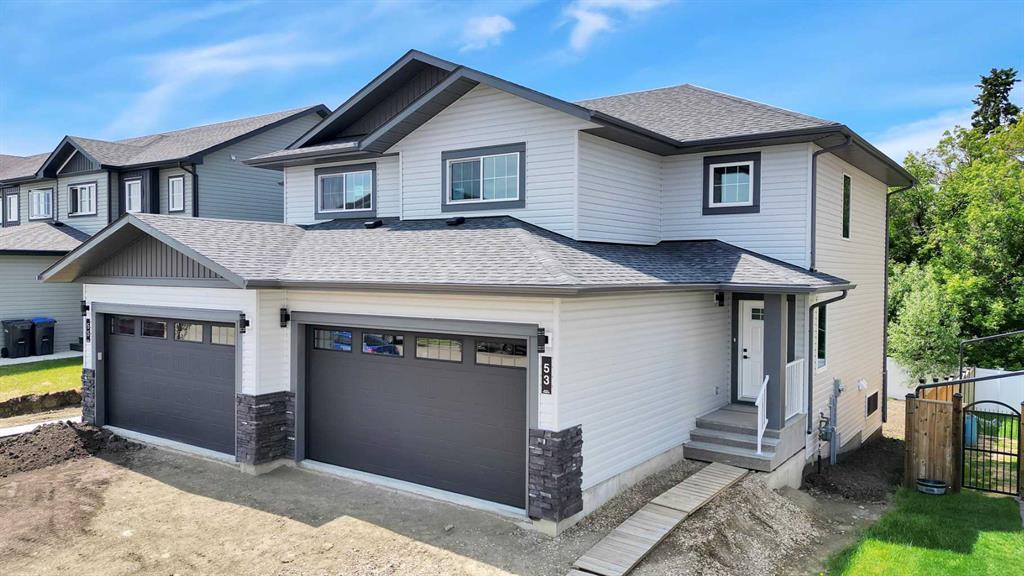 Welcome to 53 Cameron Close , this modern duplex is located the beautiful Crestview neighborhood and backs onto a treed reserve. This home features an open concept floor plan with light wood accent vinyl plank flooring. The generous kitchen island with room for the whole family to sit around and enjoy a home cooked meal. The upper floor has 2 nice sized bedrooms , upper floor laundry room , a 4pc bathroom and a spacious Primary bedroom with a 3 pc ensuite with a large walk in closet. The unfinished basement awaits your creative flair.