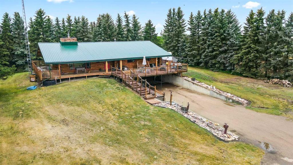 Your retreat awaits, sitting on over 11 acres this spruce log-built home has so much to offer! You enter into this grand home with an open floor plan with a large dining area, living room with wood burning fireplace, and kitchen open to one another. This space is perfect for entertaining and having gatherings! The beamed ceilings are stunning and the craftsmanship of this home is like no other! The primary bedroom is spacious with so much potential to add a full ensuite and walk in closet if you please, there is currently a 2 piece ensuite! There is another large bedroom on the main level as well. The back door has main floor laundry with lots of storage, which also leads to the 4 piece bathroom. The basement has another massive bedroom, a large living room - and so much storage! The access to the garage is in the basement - which also houses the furnace room and more storage! If you enjoy watching nature and taking in sunrises and sunsets - this deck is for you! An entire wrap-around deck is featured with this property! Not only is the wrap-around deck handy - there is a space for your RV to park beside and access your trailer! There is so much in this yard to enjoy! From the newly built (2018) 30x60 shop that is spray foam insulated with radiant heat, to the barn for your animals and numerous little sheds! There is a beautifully treed area where the firepit area is with it's own shed for storing wood and chairs! Some of the updates in this home are - deck and railing, tin roof in 2018, eaves in 2018, new flooring in 2021, and septic tank in 2019!!