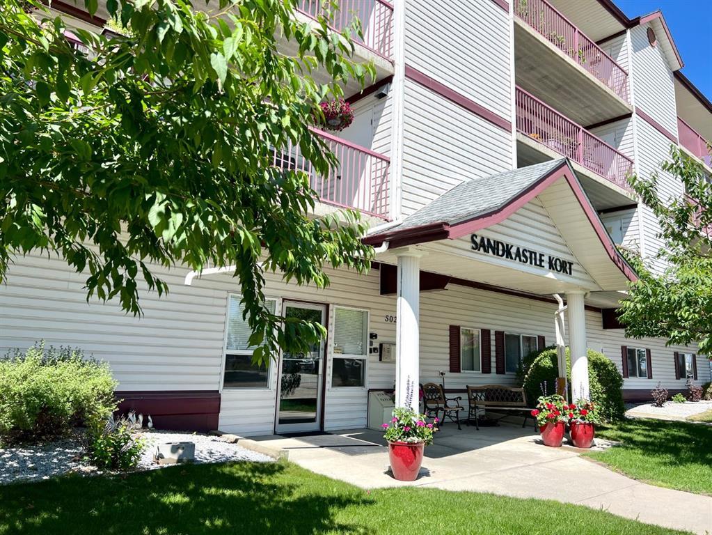 Affordable adult living in SandKastle Kort. Centrally located and within walking distance to all amenities including shopping, banks, restaurants, medical clinic and hospital. This west facing condo offers an open concept main living space with crisp white kitchen cabinetry complete with new countertops and added pullouts making it wheelchair friendly. Brand new stove in 2022 and a convenient pantry with built in shelving. The living room has remote blinds on the patio doors out to the balcony and a view of the mountains. 2 bedrooms including the primary with good closet space and a 3 piece ensuite. There's a big laundry room with shelving for additional storage and a full 4 piece guest bathroom. The balcony also offers an additional storage room. The entire condo has new vinyl plank throughout. This is a quality built condo complex that features a heated ground level parkade, recreation room and secure entry with intercom system and mailboxes.