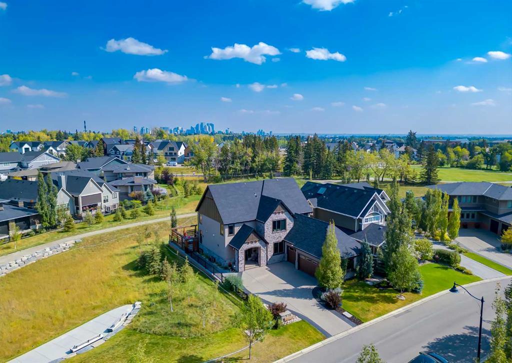 Welcome to this exquisite luxury estate home nestled in a serene and picturesque setting, yet only 7 minutes to downtown. Situated in a prestigious neighbourhood, siding and backing onto a sprawling 14-acre green space, with 5 bedrooms, 4 bathrooms, and a host of luxurious features, this home provides exceptional living experiences. Upon arriving, you'll be greeted by timeless architecture and meticulous craftsmanship. The foyer welcomes you with a grand tiled entrance, soaring ceilings and abundant natural light. The main level boasts an open-concept design, creating seamless transitions between the living, dining and family areas. Large windows throughout offer views of the green space. The formal living room has crown moulding and a double-sided gas fireplace to the kitchen with views of the yard and green space. Light flows in all day but can easily be shaded by the powered blinds. The gourmet kitchen is a culinary enthusiast's dream, equipped with top-of-the-line stainless steel appliances, custom cabinetry, granite and quartz countertops, abundant counter space, a large island, a 6-burner Viking gas cooktop, wall oven, Bosch dishwasher, hidden Fisher & Paykel drawer dishwasher and 2 double sinks. The main floor also features a den, a private 2-piece bathroom and a spacious & functional mud room with lockers for the whole family. A glassed door in the dining room allows you to step outside and enter your own private oasis. Winner of the 2015 Alberta Residential Landscaping Award, the backyard is a retreat with a multi-level, privacy-screened yard with stone patios, a hot tub, a deck with a built-in BBQ kitchen, bar fridge and grand tiled counter and grass and garden areas that provide fun to explore for all ages. On the upper level, the primary bedroom is a retreat featuring breathtaking views of the green space, a luxurious ensuite bathroom with a spa-like jetted tub, a large separate walk-in steam shower and an oversized walk-in closet with built-in drawer sets and custom shelves. Both kids' bedrooms have walk-in closets with custom millwork. All bedrooms in the house have blackout window coverings. The ample laundry room holds a sink, storage and hanging rod. The lower level offers recreation for all ages with a tiled gym area and a walk-behind and sit-at-wet bar with wine fridge that is open to the theatre room with a built-in wall unit. Two substantial guest bedrooms share a full, beautifully appointed bathroom. If desired, the art studio could be a third lower-level bedroom, bringing the bedroom count to six. The oversized three-car garage is finished to the highest standard with meticulous details, including painted walls, baseboards, natural gas heat, epoxy flooring and a significant dog wash basin. The prime location of this estate home offers the best of both worlds. Enjoy the tranquility of the vast green space at your doorstep while being just minutes away from the vibrant energy of downtown.