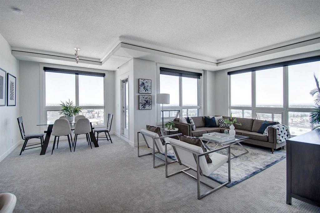 VIEWS!!! Plenty of outstanding and unobstructed views from this 20th floor corner unit complete with south and east facing views of our beautiful city and the mountains. This immaculate 2 bedroom and 2 bathroom condo has an open layout with plenty of natural light. Boasting 9 foot ceilings throughout, you are greeted with a large foyer with dual closets. The kitchen has loads of cupboard space and includes a tasteful combination of granite countertops, upgraded black appliances, and tile flooring. It also has a breakfast bar and overlooks the living and dining rooms making it perfect for entertaining guests. The configuration of the living room will allow easy placement of furniture while the dining room will accommodate a large table. Primary bedroom with a full ensuite along with the second bedroom are generous in size. Brand new carpet and paint dominate making the 1031 square foot plan feel large and inviting. Enjoy a morning coffee on the huge wraparound balcony. Corner unit is super quiet and private. Icing on the cake with an in suite washer and dryer. Heated parking, 3 elevators, well kept common area and main lobby along with 24 hour security for the complex. Close to all area shopping, transit and easy commute into downtown Calgary.