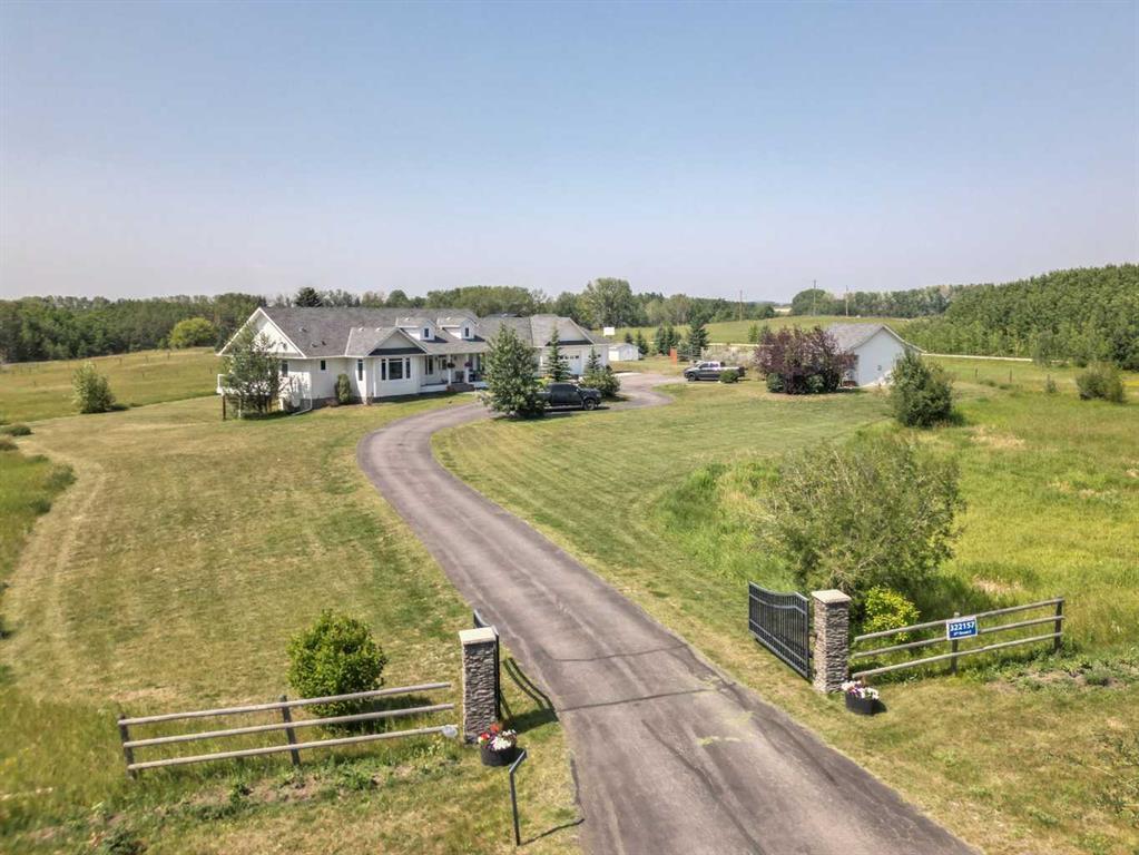 Country Farmhouse Charm with Beautiful Mountain and Valley Views. This custom built walkout bungalow is situated on 4 acres of land. From the moment you drive through your motorized gates and up the paved driveway, the charm of this home begins to set in with the front covered veranda to enjoy your morning coffee , to the gardens, the green house and guest house. Inside this bright and open home you will find comfort in the functional floor plan, as upon entering you will be greeted with hardwood floors and 10 ft ceilings setting the mood of this charming home. With tons of natural light you will enjoy cooking in your gourmet kitchen with quartz counters, a large island, and stainless steel appliances. The kitchen is open to the dining area and flows into the the living room, featuring large windows to take in the views and a floor to ceiling stone gas fireplace. Rounding out the main level is a large sun room, primary bedroom with a 5 piece bath, laundry room, and large SW facing balcony. The lower level is a completed developed walkout basement with in-floor heat, a wet bar area, 3 good sized bedrooms, 4 piece bath, a large bright second family room with a second gas fireplace. If the home itself wasn’t impressive enough there is a fully finished heated oversized triple attached garage with a rear garage door for your tractors and toys. The property has a cute 400 sq ft cottage/home office/studio with a 3 piece bath, heated floors and a fireplace. This home is easy to please with it’s space to host some animals, grow your own food or allow the kids to ride their toys. The well maintained grounds and big skies allow you to truly have the space to live a country life and still have the luxury of the big city within a 15 minute reach.