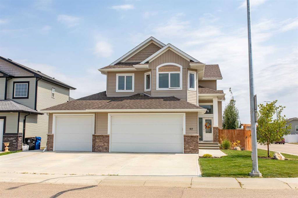 Bring your cars, quads, boats, and toys and settle in to 97 Coachman Way in Blackfalds. This spacious Modified Bi-Level sits on a 6,564 Sq.Ft. corner lot with attached Triple Garage and a Detached Double Garage! With space for everyone and everything, you can move in and enjoy for years to come, even add on a Bedroom or 2 as the family grows. The bright and open floor plan is perfect for family life or entertaining, with vaulted ceilings that keep the space open and airy. The Kitchen, with tons of cabinets, counters, and a centre island, has tons of space for prep work, as well as abundant storage in the corner pantry. Stainless appliances are offset by a beautiful tile backsplash, a truly impressive Kitchen that you’ll look forward to cooking in. The attached Living Room offers a cozy gas fireplace for cold winter days, while the spacious Dining Room overlooks the back deck with gas line for a bbq, perfect for extending your living space to the outdoors. The main floor has 2 Bedrooms and a great sized 4 Piece Bath, while the Master Suite is up a few stairs on it’s own level. With a huge walk-in closet and spa-like 5 piece Ensuite, you’ll look forward to relaxing and rejuvenating at the end of the work day. The lower level offers a great sized Rec Room for the ultimate man cave or family nights , plus space for you to add a couple of Bedrooms as you expand your family. Outside, there is no shortage of space for toys, tools, and hobbies in the Triple Attached Garage or the Double Detached Garage; make one for parking and one for your boat and quad, or turn the Detached Space into a work shop or a place to tinker on your classic car; the options are endless! The fully-fenced yard is perfect for kids and pets with a beautiful wood fence, stunning landscaping, patio paver space for dining al fresco, and a pergola that casts the perfect amount of shade over the upper deck. A private hot tub space is tucked around the corner, along with a garden shed for your yard toys or equipment. This exquisite property is located in Cottonwood Estates, a family-friendly neighbourhood that is just steps from schools, shopping, and services, allowing your family to get what they need and want without going far from home. Immaculate and move in ready, this exquisite property is ready for you to call it home!