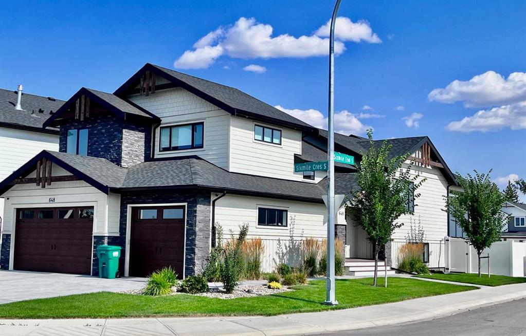 Show home on fully fenced, landscaped corner lot. This park facing property is located in the sought after area of Sixmile.The 5 bedroom, 3 bath home has extensive upgrades and plenty of extras including multi-zone heating and cooling, tankless water heater, hot water on demand, high end electrical system, central vac and kick sweep, underground sprinklers with drip line system for flowerbeds and architectural laminated composite shingles. The kitchen area is a fabulous space with its large granite island and counter tops (unique burnished gold colouring), voluminous cupboard space, double wall oven, built in garburator, double door stainless fridge , pantry, and oversized dining area. The sunken living room with floor to ceiling feature wall includes a gas fireplace with remote for intensity, lights and blower. The custom wood plank tray ceiling and large windows adds to the warmth of the room. The primary bedroom must be seen to be appreciated with matching wood plank tray ceilings, 5 piece ensuite and large walk in closet with built in shelves. The basement is fully finished with 2 bedrooms (each with walk-in closets), 4 piece bathroom, a great family room with theatre ceiling speakers and a wet bar. The home is also equipped for remote monitoring and management with external controls for heating, cooling, humidity, and many lights. 3 car heated garage with extensive built-ins and covered deck completes this beautiful home. Also has a remote sunscreen being added to the rear deck. The Alberta New Home Warranty does not expire until 2031!