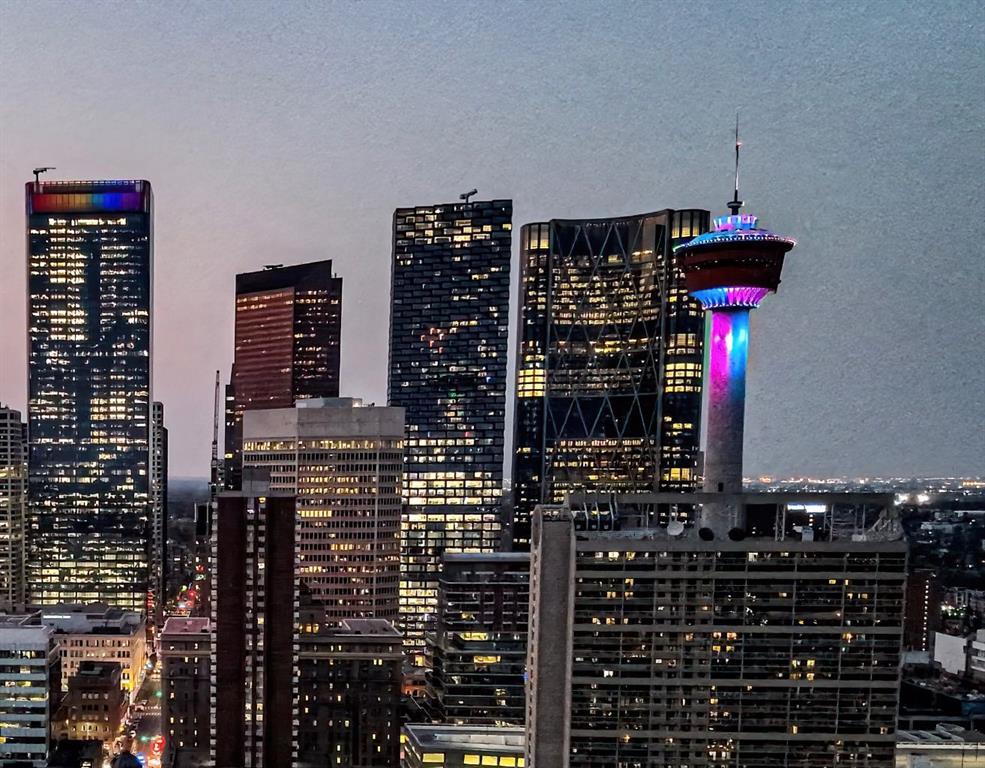 PENTHOUSE with a MILLION DOLLAR VIEW! WELCOME HOME to this RARE 2 Storey PENTHOUSE with an UNOBSTRUCTED VIEWS of the CALGARY TOWER and the AMAZING CALGARY Skyline on the 22nd and 23rd FLOOR in the COLOURS by BATTISTELLA BUILDING! This impressive Open Floor Plan with Wall to Wall Windows Spanning the Length of each Floors will make you feel Like you are On Top of the World! The Main Floor Features an Open Floor Plan with a Large Kitchen, Dining Room and Living Room PLUS a 23 Foot Balcony which will make Entertaining your Friends and Family the Talk of the Town! The Kitchen has a Large Island and Stainless Steel Appliances and Quartz Countertops! The Main Floor Guest Bath includes a Tub and Shower and a Large Walk-in Storage Room Closet complete this Floor. Upstairs you will Love your Primary Bedroom which comes with a large Walk-in Closet and a 4 Pc Ensuite includes a Soaker Tub and Custom Shower. The Upper Level also Boasts a 2nd Bedroom Perfect for Guests or a Home Office, Laundry Room and additional Entrance on the 23rd Floor. This unit comes with a Title Heated, Secure Parking Spot of +P2 Level. Perfectly Situated Downtown within Walking Distance to the Saddledome to enjoy Hockey Games and Concerts, 17th Ave to experience all the Great Restaurants Calgary has to offer such as Porch, Una, Lulu’s and more! Your Dream Awaits! Call today for a Private Tour and WELCOME HOME! Check out the Virtual Tour!