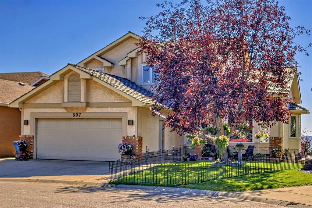 LEGAL WALKOUT BASEMENT SUITE with separate lower entrance and SECOND OVERSIZED DETACHED HEATED GARAGE. This stunning Hawkwood home is located on a quiet cul-de-sac providing 4 bedrooms, 4 1/2 bathrooms with new windows throughout (2022) and has beautiful mountain views from all 3 levels. The main floor features an updated eat-in kitchen with stainless steel appliances, new engineered hardwood flooring and a grand curved staircase with vaulted ceilings. Enjoy time with your family and guests in the formal dining area, living room, sunken family room with wood burning fireplace and the main floor deck with screened in gazebo. The office/den as well as half bath and laundry room complete this level. The upper floor has three bedrooms with a 4-piece bathroom off of the main hallway. The primary bedroom with ductless AC features an ensuite with two walk-in closets as well as newer patio doors to a private upper deck. The walkout basement with LEGAL suite has a generously sized second family room with gas fireplace, 4-piece full bathroom, fourth bedroom with full ensuite bathroom, spacious second kitchen with stainless steal appliances and island. The walk-out basement features tons of storage with a stacked washer/dryer and workbench in the utility room as well as a spacious second south facing patio. The southwest back yard is beautifully landscaped with in-ground sprinkler system (front & back) and leads to the heated second oversized garage/workshop and a small parking pad. Close to parks, schools, and shopping, this home is not to be missed.