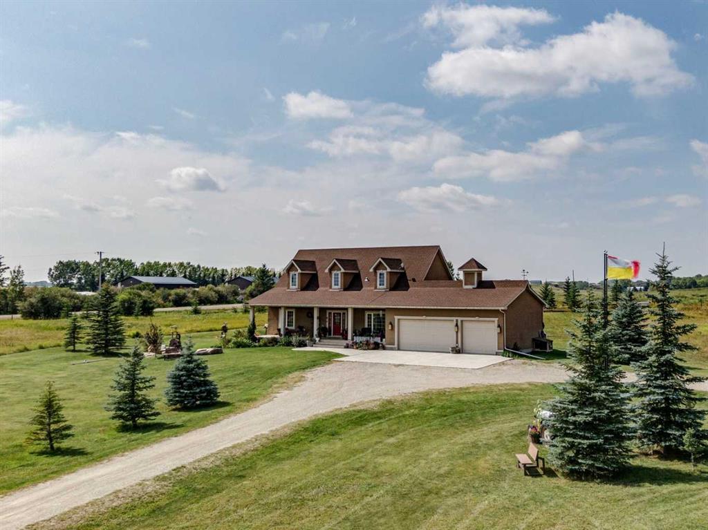 WELCOME HOME TO YOUR NEW 10 ACRE parcel just west of AIRDRIE! With over 3440 sq. ft. of DEVELOPED LIVING SPACE this sprawling bungalow offers room for the whole family! So many unbeatable upgrades inc: high ceilings, huge DORMER windows, very open floor plan, NEW FURNACE (2021) & high end water system. Enter thru the extremely generous foyer noting the WIC to the left (you will not believe the amount of storage throughout the whole home) as well as the den to your right - perfect HOME OFFICE! The kitchen has undergone a major facelift & is now host to gorgeous CREAM COLORED CABINETS as well has a huge island, massive walkthrough pantry, loads of cabinets, GAS STOVE & GRANITE countertops & a wine fridge. Beyond the kitchen enjoy more outdoor space past your massive DINING AREA - this is a true farm table style space. The large open great room features a stunning gas fireplace & views out to your WEST BACK YARD. Tucked away beyond the great room is your primary bedroom w/a very generous WIC w/shelving & storage galore. Through the bedroom is another private outdoor area - perfect place to unwind after a long day. Don't forget the 5 pce ensuite that is host to an AIR TUB, sep SHOWER, sep water closet & dual SINKS. The lower level is tastefully finished w/ large recreation room, 2 extremely generous bedrooms (both with WIC) and a full bath. Don't forget the bar area for all of your entertaining. There is in-floor heat in basement as well as in the triple attached garage. Outside find your 50x40 HEATED shop w/overhead doors for all of your toys as well as a concrete floor! This 10 acre parcel is fenced and cross fenced & has a garden area, loads of yard space & room for your horses. Call today!