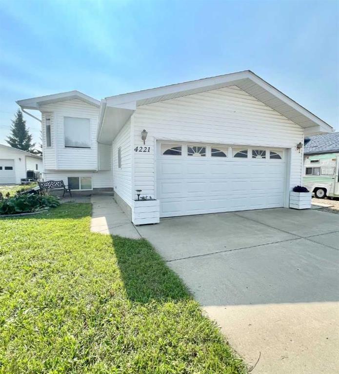 Welcome to 4221 47a Avenue a quiet cul-de-sac located in Vermilion, Alberta! The first thing you notice about this stunning 4 bedroom 2 bathroom bi-level is the attention to detail and the landscaping around the home that showcases the beautiful wildflowers that were planted and the several fruit trees and mature trees that surround the home - making it a private sheltered oasis. You have a generous size 2 car garage with side exterior access along with a concrete parking pad that provides additional parking for your vehicles or RV. You have two bedrooms on the top floor - Your master bedroom is bright with ample space and also includes his and her closets! The second bedroom on the top floor includes a wraparound walk-in closet with a closet bench and a nook for extra storage. The living room has lots of light with big windows and is a great size. The kitchen has ample amounts of storage coupled with beautiful oak cabinetry and a nice size dining area with direct access to your back deck where you can tend to your garden, pick the apples from the trees, and store all of your tools and gardening equipment in your storage shed! Each floor also has its own bathroom! Downstairs you have huge carpeted Rec/Family Room with a switch operated gas fireplace. You have walk-through laundry room located down a 6 stair walk-up from your entry way and completing the downstairs is 2 bright good sized bedrooms, your 4pc bathroom and your utility closet that has extra storage(crawl space under the stairs) along with your furnace, hot water tank, sump and water softener that you can hook up and utilize as needed. Don't miss out on this beautiful property - It is ready for it's next new owners today!