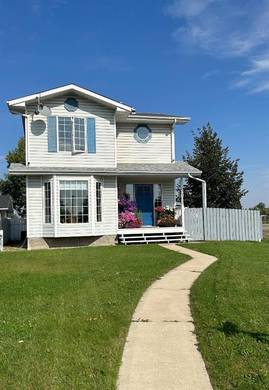 This 2 storey home is conveniently located on a corner lot in a cul de sac on the north end of town. Main floor offers a Living room, dining area, kitchen and bath. There are 3 bedrooms on the upper level. The basement is currently undeveloped but could easily be completed. There is a large rear deck, double detached garage that is finished and heated. Yard is landscaped and fenced.