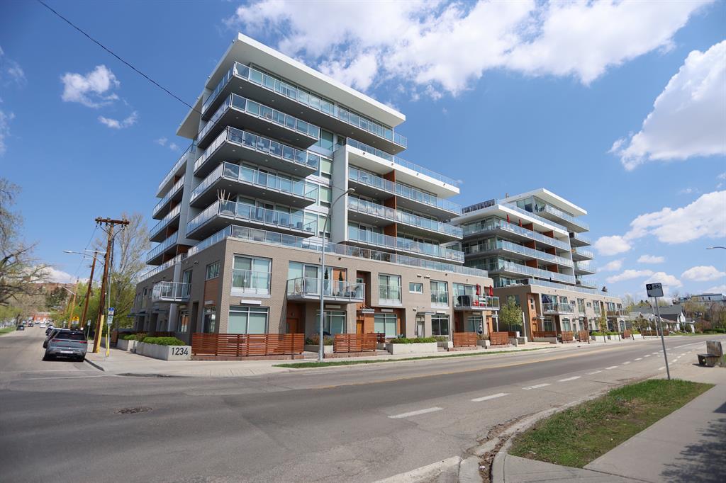 Welcome to EZRA ON RILEY PARK! Amazing value in this sleek 1 bedroom condo in the popular inner city community of Hillhurst, backing onto historic Riley Park. Located on the 5th floor in the West tower of this concrete & steel complex, this stylish home enjoys laminate floors & high ceilings, designer kitchen with quartz counters & East-facing balcony with partial views of the downtown skyline & Riley Park. This super home has floor-to-ceiling windows with custom roller blinds, bright living room with sliding doors to the balcony & open concept kitchen with high-gloss cabinetry, glistening backsplash & upgraded Blomberg & Samsung appliances. The bedroom has a mirrored closet & the bathroom has quartz counters & tile floors. Insuite laundry with space-saving Whirlpool washer & dryer. Covered balcony with gas BBQ line. Additional features include unit-controlled central air & heating with NEST thermostat, radiant infloor heating & storage cage in the underground parkade. Residents of EZRA also have access to the top-notch amenities: fitness centre, wine storage/tasting room, bike storage & the Ezra Club lounge. Highly-desirable location next to the Hillhurst/Sunnyside community centre & only a few short minutes to SAIT & LRT, vibrant Kensington district with its trendy shop & restaurants, downtown & the Bow River.