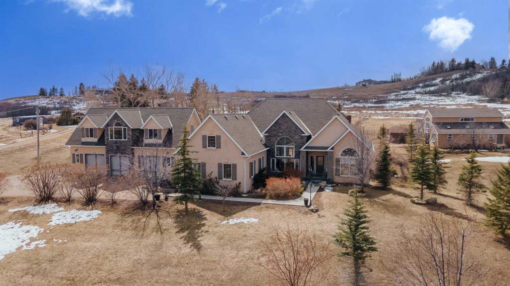Situated on over 5 acres of picturesque landscape, this unique multi-generational home is just minutes away from Calgary's southern city limits, offering both city and mountain views.