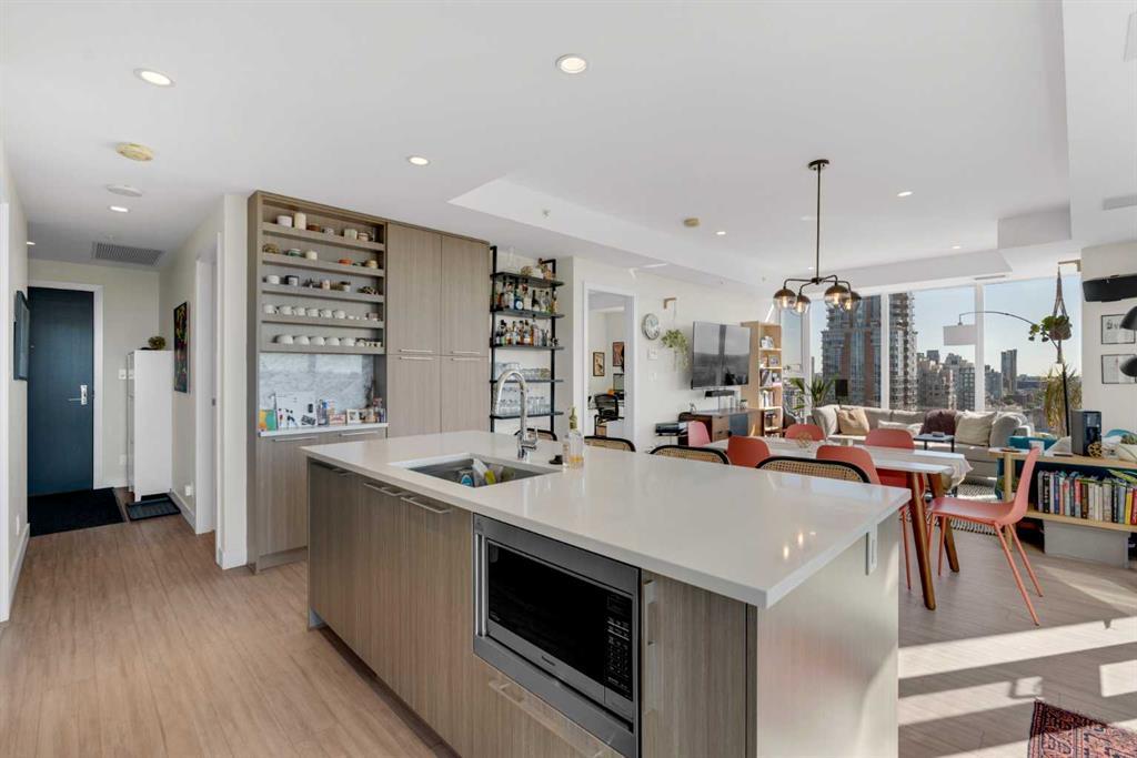 Unbelievable views from this 2 bedroom, 2 bathroom corner unit in the amenity-rich Royal Building. This modern and sophisticated unit has it all – quality craftsmanship, a plethora of natural light, central air conditioning and a grand open floor plan perfectly situated around the double walls of windows showcasing those unforgettable views. Culinary adventures are inspired in the gorgeous gourmet kitchen featuring stone countertops, a gas stove, a built-in refrigerator, a plethora of full-height cabinets, a centre island and of course endless views. The dining room centres the open concept space with plenty of casually elegant space for meals and entertaining. Nestled amongst floor to ceiling windows the living is truly a phenomenal retreat for basking in infinite city views. Enjoy morning coffees and evening barbeques on the expansive deck or simply unwind with the city lights and stampede fireworks as the breathtaking backdrop. Wake up each day with those spectacular views from the indulgent primary bedroom that also boasts a luxurious ensuite with dual vanities and an oversized shower. Perfectly situated on the other side of the unit for ultimate privacy is the second bedroom and second bathroom. In-suite laundry and underground parking add to your convenience. Residents enjoy the added benefits of a fitness centre, steam room, sauna, squash court, 24-hour concierge/security (no more missing packages!), an outdoor courtyard and private dining and social rooms perfect for hosting events. Ideally located mere steps to 17th Avenue – within walking distance to some of Calgary’s best restaurants, cafes, nightlife and shops. Plus the building is connected to Canadian Tire and Urban Fare Market. This outstanding home in a perfect location lets you embrace a maintenance-free urban lifestyle at its finest!