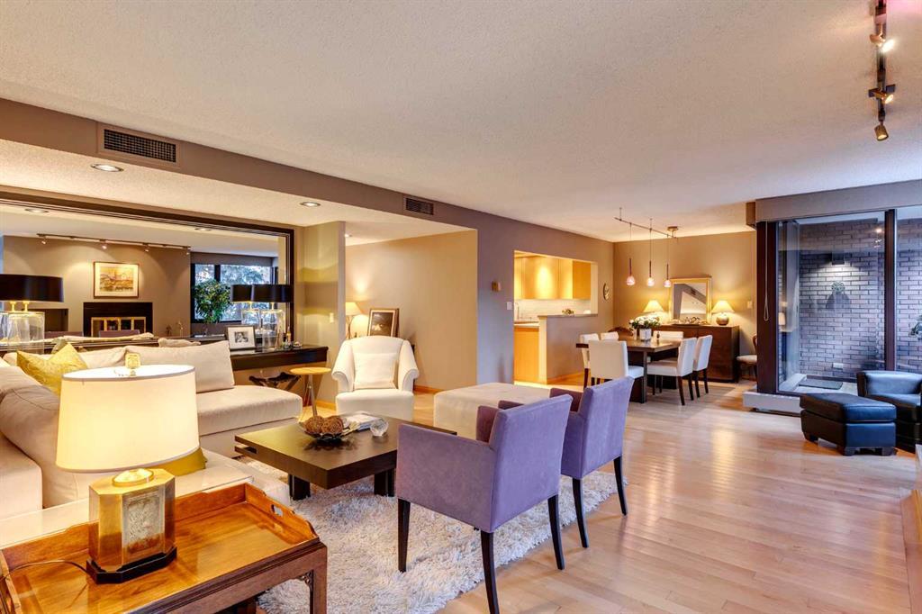 Fantastic single-level residence in Eau Claire Estates…one of the most desirable buildings in the area. Prime location nestled along the banks of the Bow River, Prince's Island and close to all the amenities of the downtown core. The K tower is conveniently located close to the front entry and Concierge desk. The suite offers generous size and a great layout. It is one of the few units to have both a balcony and a large terrace overlooking the central courtyard that features lush plantings and a water feature in the summer months. A high quality and professional renovation of the entire suite was completed several years ago. Hardwood floors run throughout the generous and open plan principal rooms. Features include a fireplace, an office station with built-in desk and storage and a balcony. Large chef’s kitchen is open to the dining room and features ample custom cabinetry including lots of pantry space, top appliances, and a large island with overhang for stools. A walk-in butler’s pantry has additional storage and bar fridge for entertaining. The tranquil primary suite has sliding doors out to the west exposure terrace, beautiful window coverings, a walk-in closet with organizers and a renovated 4-piece ensuite with double sinks and steam shower with multiple heads and bench. The den-second bedroom has a door out to the terrace and is next to a renovated 4 piece bath. Separate renovated laundry room. Additional features include in-suite garbage chute and 2 parking stalls (in tandem) in the heated parkade. Features of the building include: concierge, fitness facilities, party room, visitor parking, car wash and on-site management. Welcome home…