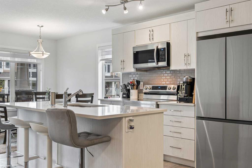 Welcome to the NO CONDO FEE Ripley End Unit in the heart of the newly developed and highly sought-after Yorkville community. This 3 BED, 2.5 BATH + BONUS ROOM townhome features an ATTACHED 2-CAR GARAGE, $15,000 in UPGRADES and builder measurements of 1,460 sqft. This home is sure to make an incomparable investment as It also comes with the 10-YEAR ALBERTA NEW HOME WARRANTY. The bright main floor boasts modern and durable luxury vinyl plank flooring, ideal for families and pet owners. Its seamless flow creates a sense of continuity from one area to the next. The kitchen is a culinary delight, with gleaming white, soft-close, cabinetry, easy-to-maintain quartz countertops, and modern stainless-steel appliances. The kitchen island offers a gathering place with bar seating for all to enjoy. The upgraded French door refrigerator with icemaker ensures your kitchen is as functional as it is beautiful. The cozy family room provides ample space for a sectional sofa and a large-screen television. A powder room is also conveniently located on the first floor, right off the attached, two-car garage. Upstairs, discover a generously sized bonus room, ideal for a home office, playroom, or additional living space. The primary bedroom, complete with its ensuite bathroom and a spacious walk-in closet, is tucked away from the other two bedrooms for the utmost privacy. Both upstairs 4-piece bathrooms feature modern quartz countertops and floor-to-ceiling tiles around the soaker baths. The laundry room is also conveniently located upstairs. The sellers have thoughtfully added the washer and dryer as well as window coverings throughout to create a turn-key property. A bathroom rough-in has also been added for future basement development. This wonderful home has a nice side yard, perfect for playing, gardening or just soaking in the sun. Walking distance to the Yorkstone Playground and minutes away from shopping, restaurants, and schools, the Somerset C-train station is also less than 10 minutes away. Don't miss the chance to make this gem your home. Contact your favorite realtor today to book a showing and experience everything this townhome has to offer!