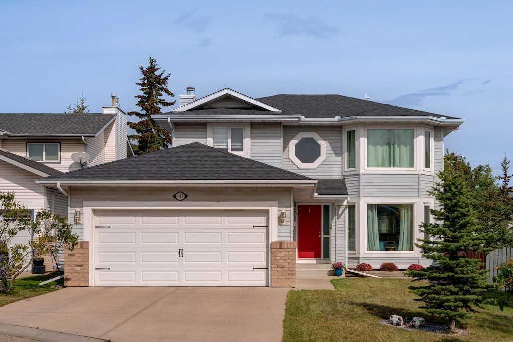 Nestled in a tranquil cul-de-sac, this family home is located mere minutes from two distinguished elementary schools, multiple parks/playgrounds for children to play, as well as tennis courts and a baseball diamond to enjoy. Situated on a generous pie-shaped lot, this two-story residence embodies the epitome of a warm and cozy family home. Style and charm shine through with hardwood floors, grand arches, stylish paint selections, and a bright open layout grace the main level. The living spaces are truly the heart of the home, offering vaulted ceilings, skylights and a magnificent wood-burning fireplace ensconced in a white painted brick surround, offering a warm and inviting focal point to gather around. Doors off the living room lead you into the sprawling backyard, presenting a perfect patio space and lots of green space to enjoy. The kitchen effortlessly marries style and functionality. Adorned with painted two tone cabinets, showcasing a tasteful fusion of color; gleaming stainless steel appliances with sleek lines and a polished finish that perfectly complements granite counters. The harmony between form and function is truly palpable, creating a space that not only inspires culinary creativity but also beckons family and friends to gather and enjoy a meal together. The upper level features a full bath, and four spacious bedrooms including the primary suite, which offers its own ensuite bath. The basement boasts a contemporary full bath plus an abundance of extra living space, ideal for a kids playroom, office space, or the ultimate man cave. The property also benefits from excellent proximity to public transportation, the YMCA, a library, Stoney Trail, and the abundant amenities of Crowfoot Crossing.