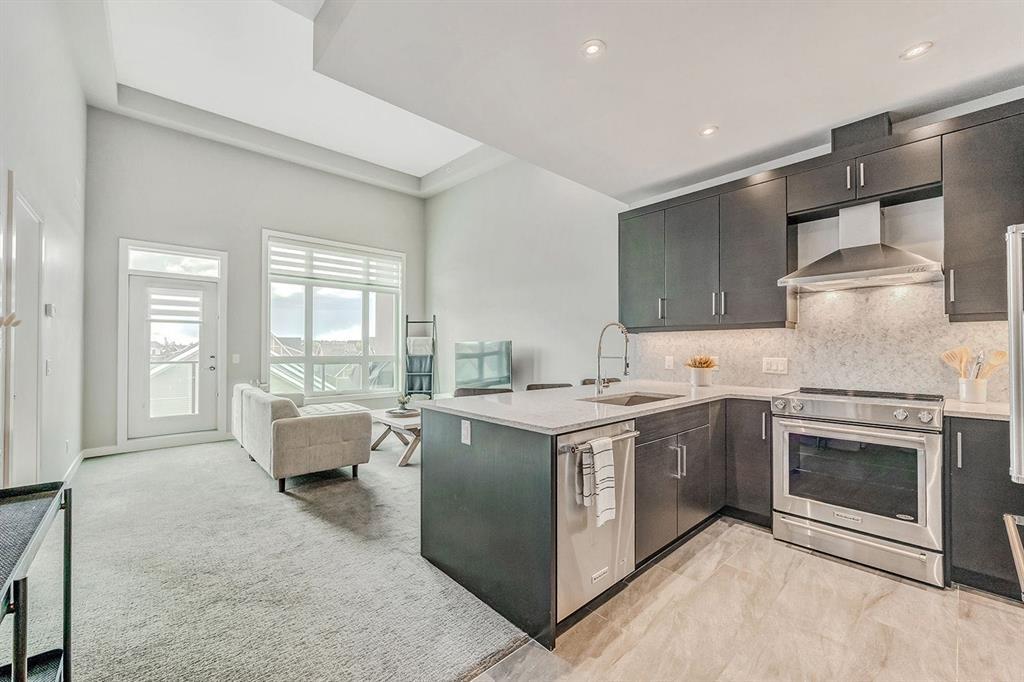 Welcome to this stunning one-bedroom, one-bathroom condo perched on the top floor of the Armory, located in the heart of Currie Barracks! The condo has a prime position within this 18+ building, offering an inviting and spacious open-concept floor plan with soaring 13’5” ceilings in the living room. The kitchen is a chef's dream, featuring upgraded KitchenAid appliances, a spacious farmhouse sink, and ample counter space for both culinary endeavours and entertaining. Flooded with natural sunlight, the bedroom and living area boast oversized windows that frame captivating west-facing views. Step outside onto the expansive 219 square foot balcony to enjoy a serene and private outdoor sanctuary. One titled parking space and assigned storage is located in the heated underground parkade. Located mere minutes from downtown, shopping, parks, Mount Royal University, and other essential amenities, this condo offers the perfect blend of comfort and accessibility for your next home.