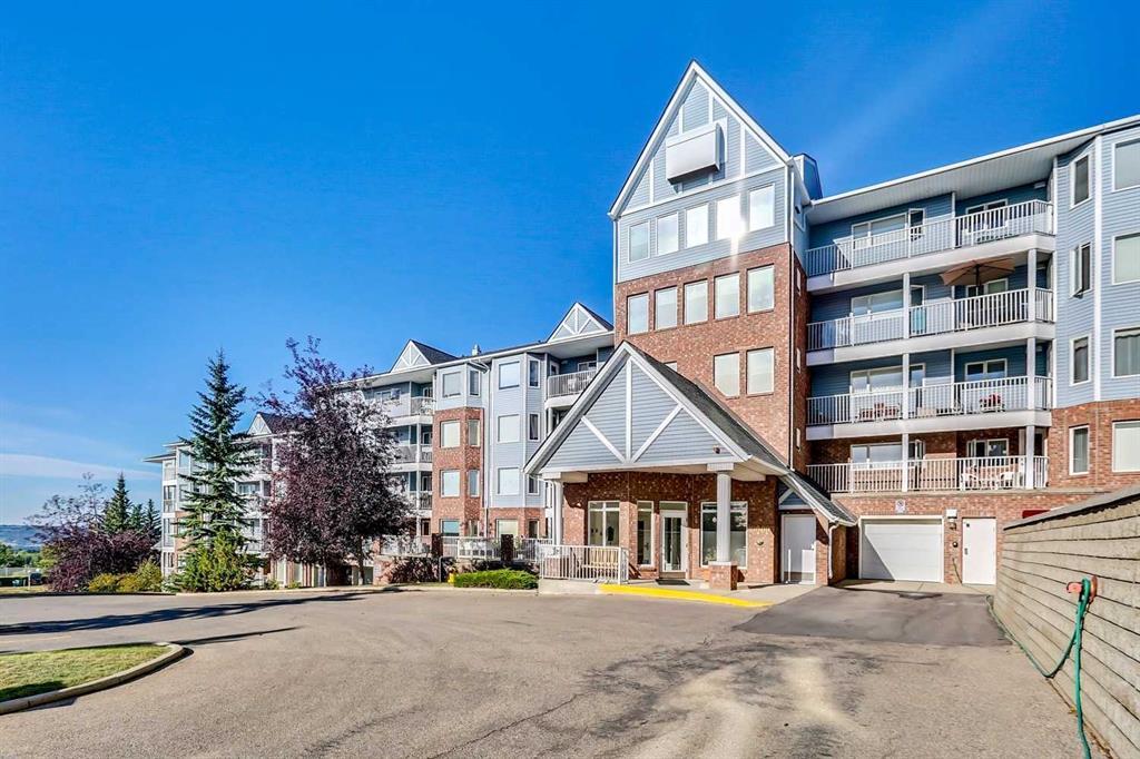 Dreamview Village - Hawkwood - #3213, 3000 Hawksbrow Point NW: This 937 sq ft end-unit is located in sought-after Dreamview Village. The 2 bedroom + 2 bathroom unit has new carpet throughout and includes one titled underground parking stall. This bright, open plan features a kitchen with a dishwasher, microwave, refrigerator, electric stove, and hood fan; an open dining area and living room with access to the extra-large 500+ sq ft private patio with BBQ gas hook up. The large primary bedroom has two closets and a spacious 3 pc ensuite with a glass shower; a 2nd bedroom, a 4 pc main bathroom, and a laundry room with a full-sized washer and dryer and storage complete this unit. Enjoy the views of a beautiful pond with a fountain on your way over to the clubhouse. Dreamview Village is a 55+ building with endless amenities including a guest suite, woodworking shop, library, billiards, clubhouse kitchen and patio, visitor parking & much more! Condo fees include heat, electricity, and water. Located in Hawkwood, conveniently located close to walking paths, easy access to Stoney Trail, John Laurie Blvd, and Crowchild Trail, and just minutes to the Crowfoot LRT station and Dalhouise LRT station. The building and the unit are well-maintained.and easy to show with quick possession available. Some photos have been virtually staged. Call for more info!