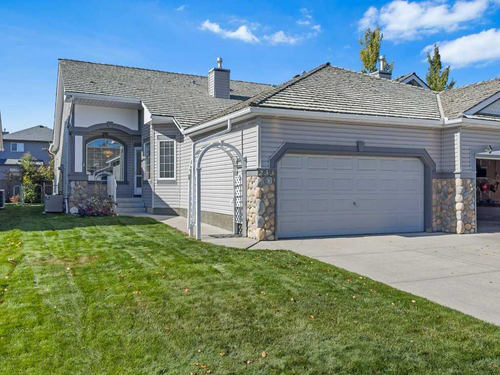 **OPEN HOUSE CANCELLED OFFER RECEIVED** Would you love to live in a BUNGALOW VILLA community with NO MAINTENANCE FEES? Would you love to be in a LAKE COMMUNITY where you can stay active, or take the grandkids to the beach for some fun. Welcome to your ideal retirement community, an attractive development with many retired neighbours and well-manicured lawns. Come see 233 Chaparral Villas! With a DOUBLE ATTACHED GARAGE and FINISHED space in the basement, you will have room for your vehicles and your guests, but EVERYTHING YOU NEED is ON ONE LEVEL! Beautifully cared for, you can just move in and enjoy! From the moment you step in the front door you will appreciate attention to detail. The large front window is curve-topped. For consistency, the hallway arch and decorative niche by the front door (with custom mirror) were designed with a matching arch. The front dining room maintains the open floor plan but the space is defined by a tasteful dropped bulkhead outlining the dining area. On the MAIN LEVEL are TWO BEDROOMS and TWO FULL BATHROOMS. NINE FOOT main floor CEILINGS! How about a kitchen with a large central island, and a corner pantry for easy access to all your baking and grocery items? GRANITE COUNTERS and STAINLESS STEEL appliances! WHITE CABINETS with upper crown and lower valance. The kitchen is open to the living room which has a COZY CORNER FIREPLACE. The eating area is open to the back deck. The BACKYARD IS WEST-FACING, and has mature trees providing ample shade on hot summer days. Cozy feeling summer and winter with TWO FIREPLACES AND CENTRAL AIR CONDITIONING! At the end of your day you will love the spacious primary bedroom with large walk-in closet and FULL ENSUITE BATHROOM. How about a warm soak in the corner tub? Or a separate shower area to get ready in the morning. PRISTINE HARDWOOD FLOORING runs through almost the entire main level! Head DOWNSTAIRS: You will find ANOTHER TWO BEDROOMS, another FULL BATHROROM and a rec room with a SECOND CORNER FIREPLACE detailed with mantel, columns, and tile surround. When friends (or grandkids) visit, head over to the lake and enjoy a wide range of outdoor activities, including SKATING, FISHING, BOATING, SWIMMING, and TENNIS OR PICKLEBALL! Book your showing today. Annual lake fee is mandatory... and worth it!