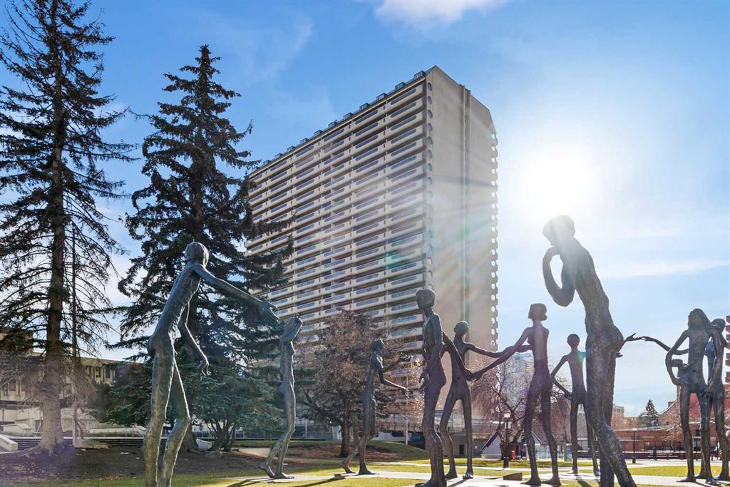 *Investors Alert* BACK ON MARKET DUE TO FINANCING** Great price and option to hold until Jan, 2024. Tenant is happy to stay longer if preferred. Located in the heart of Calgary's bustling Downtown Commercial Core, your retreat at Rocky Mountain Court awaits! This charming 1 bed, 1 bath condo offers 713 sqft of living space. As you enter the unit, you'll immediately notice the functional layout. A coat closet in the foyer to store your jackets and shoes after a long day and a kitchen opposite. The kitchen has granite countertops, a gas stove, dishwasher, refrigerator as well as an eat-up breakfast bar with a convenient spot for casual meals, enhancing the overall charm of the home. Heading into the spacious living room you'll see a nice feature wall and updated floors; this area also provides access to the large 27' x 8' balcony. If you love views of the City and Bow River, this may very well become one of your favorite spaces in the home. The size continues into the Primary which could easily fit a king size bed and furniture, it also has a full closet with built-in organizers. End of the hall is a 4pc Bathroom and an office nook (used as storage/pantry currently) to complete the space! The amenities here include a gym with shower and sauna, plus a racquet court/basketball half-court and large roof deck. The building is monitored and maintained well by professional on-site management and caretakers. The great thing about the location of this home, is that it opens the door to the Plus 15 network, allowing you to stroll to work, shopping and restaurants with ease. This unit is also be accompanied by an assigned parking stall.