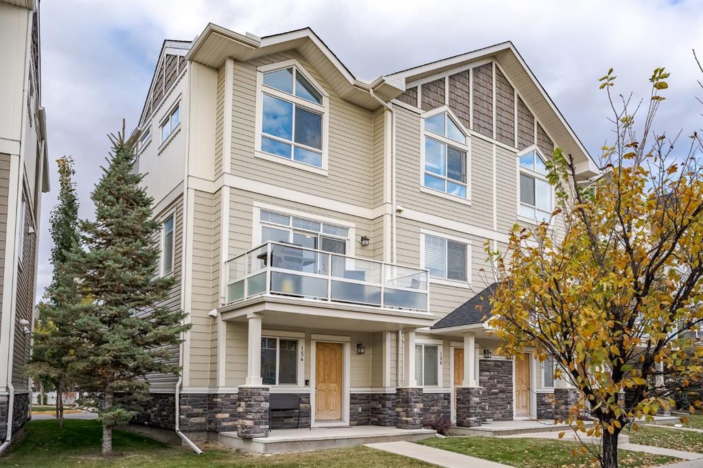 ATTENTION INVESTORS! Fantastic opportunity to own in beautiful Skyview Ranch. Large End Unit townhouse with bright, open floor plan, neutral decor and numerous upgrades like vaulted ceilings, hardwood flooring & more. Lower level boasts an oversized attached garage with additional storage, convenient flex/den/ 3rd bedroom, utility room & 2 piece bathroom. Main level features hardwood flooring throughout, spacious family room with cozy gas fireplace and built in shelving. Beautiful kitchen with large central island, stainless steel appliances, tile backsplash and spacious dining nook with sliding glass doors to your sunny, west facing balcony. Upper Level with Owner’s Suite has vaulted ceilings, double closets and private 4 piece en-suite. Another good sized bedroom with walk-in closet, additional 4 piece bathroom and convenient laundry room including sink complete the top floor. Great location- close to all amenities including shopping, transportation, school and more. A Must See!