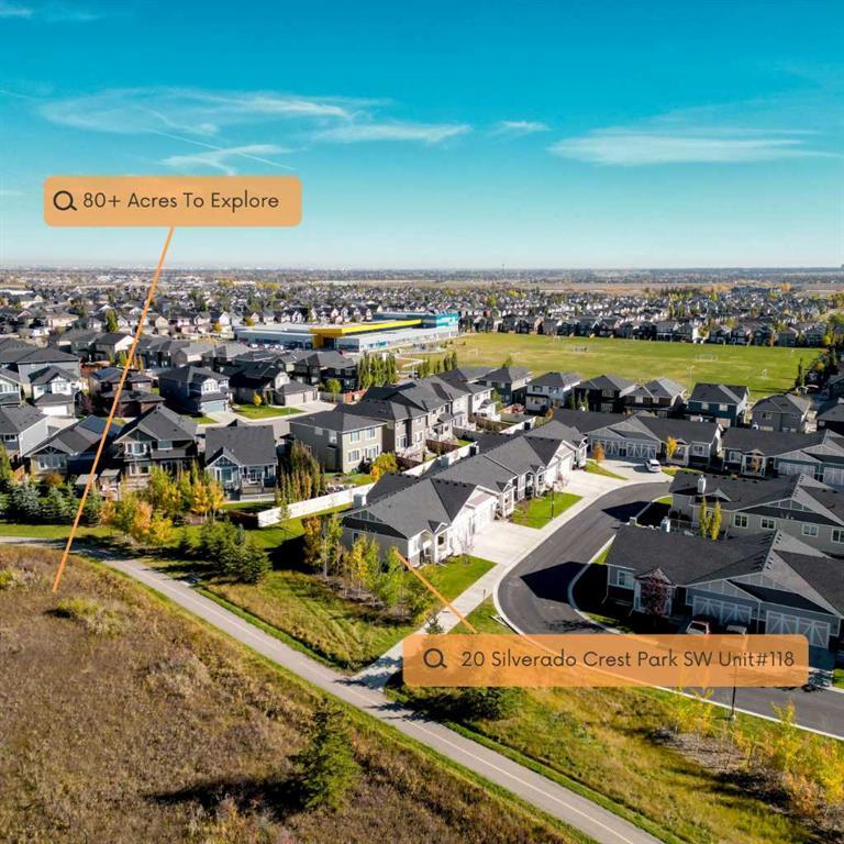 Exceptional Location within the Complex | Adjacent to 80+ Acres of Environmental Reserve | West-Facing Exposure | Surrounded by Serene Pathways and Natural Beauty | Welcome to unit #118 in The Villas of Silverado, boasting arguably the best location within this development. This charming bungalow villa is uniquely positioned, nestled alongside a sprawling nature reserve, ensuring unparalleled privacy and an abundance of natural light that graces every corner of the home through its generously sized windows. The main level of this residence is thoughtfully designed with LVP flooring throughout the entire level, featuring a spacious living area that revolves around an upgraded Dimplex fireplace. From here, you have direct access to a sizable west-facing patio, complete with a natural gas hook-up, making it the ideal spot for leisurely summer evenings, whether sipping wine or hosting a barbecue gathering with friends and family. The kitchen is a culinary enthusiast's dream, equipped with every conceivable upgrade, including a convenient butler station, top-notch Whirlpool appliances, elegant lighting fixtures, and enhanced storage with upgraded pots and pans drawers. Convenience is paramount, with the sizeable primary bedroom on the main level offering a spa-like 5-piece ensuite and a walkthrough closet. Additionally, the main level encompasses a full laundry room, a convenient 2-piece powder room, and direct access to the fully insulated attached double garage. The fully developed basement expands the possibilities for this home, perfect for family gatherings, accommodating guests, or simply unwinding while catching a Flames game this season. The spacious rec room provides ample relaxation space and a dedicated area for card games or board games, with upgraded carpet and underlay throughout. You'll also discover a generously sized second bedroom with a walk-in closet, a versatile full-size den/office that easily doubles as a third bedroom thanks to its built-in Murphy bed, a well-appointed 4-piece bathroom, and plentiful storage spaces. The location of this property is truly exceptional and caters to those who relish jogging, biking, or birdwatching, with over 80 acres of pristine natural beauty right next to your private backyard. With convenient access to Stoney Trail, nearby shopping centers, reputable schools, and charming parks, this is a location that should not be overlooked. Schedule your private showing today and discover the lifestyle that awaits you.