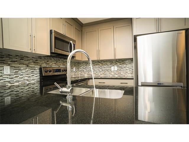 Welcome to this TOP FLOOR, END UNIT! This is a gorgeous complex that has been well maintained. The unit features: open concept kitchen with extended wood cabinets, S/S appliances package, gorgeous backsplash and elegant granite countertops. Premium cork floors in kitchen and in the living room, upgraded carpet in the bedroom. Bathroom features soaker tub, linen closet. Bedroom offers a large walk-in closet and the whole unit offers 4"baseboards with neutral paint colors. The spacious private balcony is great for enjoyment, and has a GASLINE for BBQ. This unit comes with in-suite front load laundry, large closets. The titled parking stall is viewable from the unit and right in front of building entrance! There is ample visitor parking, which is also wheelchair accessible. The common areas are clean with spacious hallways. This is a great place to call home or great rental property.
