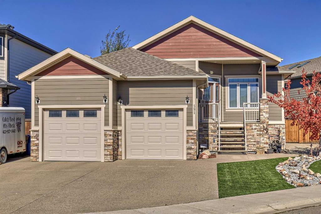 Large custom built BUNGALOW, TWO DOUBLE GARAGES, WALK UP BASEMENT, main floor laundry, beautiful WOOD FLOORS, spacious foyer, main floor office, main floor gas fireplace, amazing kitchen with large walk thru pantry, quartz countertops, high ceilings, central island, large eating area for the special dinners, lots of cabinets and stainless steel appliances, no maintenance yard featuring turf and rock, 3300 SQ FT of living space, and a 50FT RV PARKING PAD to bring home the big boy toys! Off the kitchen you have a covered rear deck built to entertain. LARGE MASTER BEDROOM (king size bed) with 5 piece ensuite, tub and double shower, double sink, private water closet, and large walk in closet. Notice the lighted tray ceiling! Downstairs is all developed. Perfect for home occupation or multigenerational! Have your heated shop in the back with 220 wiring and security system! Office for your shop can just beside the basement entrance. RV Parking pad can house your truck. OR Amazing opportunity to live in as MULTI GENERATIONAL HOUSING if kids stay around longer, or if a parent/grandparent lives with you instead of paying seniors housing cost- as there is a separate garage, separate entrance, separate laundry could be installed down , 2 bedrooms, full bath, fireplace in large family room, separate office, high ceilings, huge basement windows. Easy to show and negotiable possession.