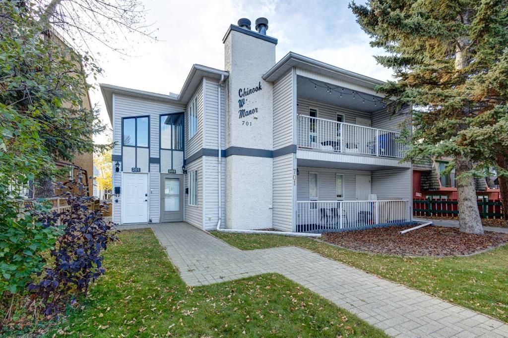 Welcome to this recently renovated comfortable unit located in the heart of beautiful Windsor Park within walking distance to Chinook Mall, the shops of Britannia Plaza, public transportation, many dining options and other great amenities. This bright south facing main floor unit has a functional floor plan at almost 1000 square feet featuring a large family room anchored by a corner wood burning fireplace with gas log lighter, 2 bedrooms, 2 bathrooms and full sized laundry. The primary bedroom, with a walk in closet, has a private 4 piece en-suite, the second bedroom at the opposite end of the unit could easily double as a home office. The spacious kitchen has tons of cabinets and counter space, good sized eating bar with additional lower cabinets and finished with stylish subway tile backsplash. Upgrades comprise of plush carpeting, plank flooring, bathroom finishes, kitchen counters and cabinets. Included with this unit is a huge separate storage locker located in the lower level and a parking stall in the back, steps from your front door. This quiet low key building is self managed with only 6 units and has very low condo fee's - a great value in a great area!