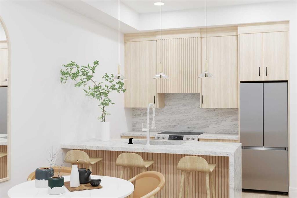 Welcome home to Quesnay at Currie Barracks. This desirable community provides home owners with the convenience of inner-city living within a master planned community. Just minutes to Mount Royal University and the downtown core, this development is in the perfect location. The "Rosa" takes functional space to a whole new level. Whether you are a first time home buyer or investor, this floorplan has everything you need at an amazing price point. Designer interiors curated by award winning designer Louis Duncan-He. This is an opportunity you won't want to miss. Secure your designer condo today. Photos are of designer finishes and similar specification level, they are not representative of exact floorplan.