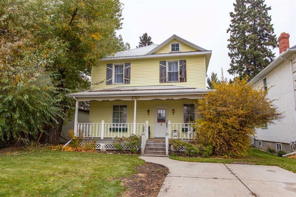 Beautiful character home on main street Lacombe! This home is situated on a very large lot measuring 50 x 264 that has an abundance of mature landscaping, floral and rock gardens plus privacy in the backyard! Great curb appeal and from the moment you walk up to the front veranda and open the front door - you will be impressed with the gorgeous original wood work, original leaded glass windows and character that is evident throughout! Main floor has a formal living room and dining room, kitchen, bedroom, 2 piece bathroom, workshop/mudroom, family room & sunroom looking into the beautiful backyard! Entertaining family and friends will be a breeze in this spacious two storey home. Upper level is home to spacious primary plus two more bedrooms and a four piece bathroom. The primary was formerly two separate bedrooms and could be converted back to two bedrooms giving you four bedrooms on the upper level. Basement has a games room, lots of storage and laundry area. This was the Manager of the Royal Bank's House from 1920 (it is believed it was built in 1904 as per historic records but City records say 1920) and boasts lovely hardwood flooring, cinder block basement in 1987 with concrete & rebar in the cinder blocks with a new floor that was poured in 1990, new windows in both bedrooms upstairs an bathroom, electrical fully upgraded, hot water tanks 2014 & 2001, furnace was replaced in October 2001, metal roof in 1987, siding installed in 1987 with styrofoam insulation. This is the perfect place for the growing family and for people who appreciate the uniqueness of heritage homes and their extensive wood work, built ins and want an oversized private back yard. Two sheds plus a playhouse in the back - lots of room to build a garage or shop! This home awaits its new family!