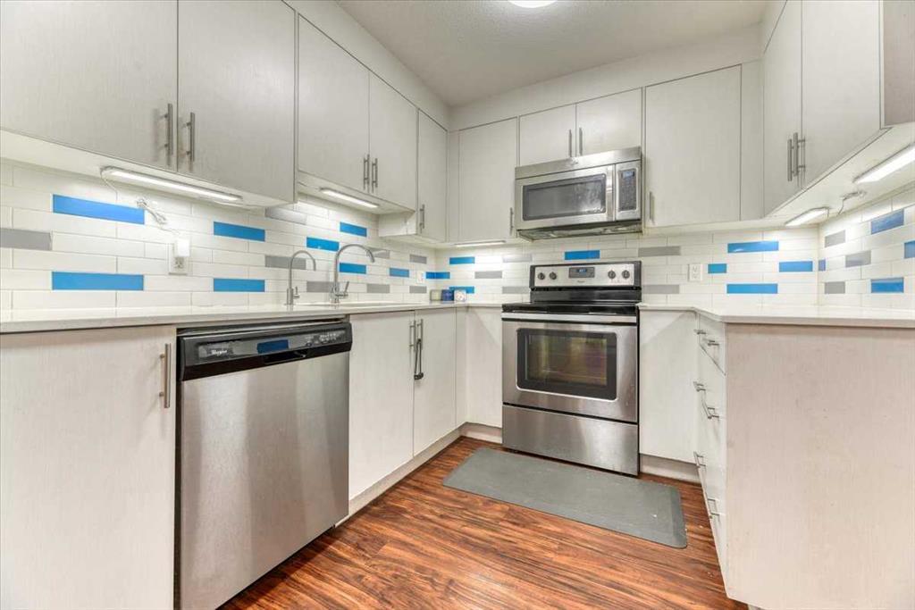 Highly Sought After South Facing Unit in Orchard Sky! This newly updated 2 bedroom 2 bath condo has new luxury plank flooring and fresh paint. This home has an open concept design which features a gorgeous U-Shaped Kitchen with quartz countertops and stainless steel appliances. A spacious dining/living room with patio doors to the deck. The 2 bedrooms are separated by the living room. The Primary Bedroom comfortably fits a king sized bed and features pass through his/her closets to the 4pc ensuite. The 2nd bedroom is spacious and located beside the 4pc guest bath. There have been thoughful updates done such as cieling fans installed, a 7 Stage RO Water Filteration System, Additional Storage Shelves added in the bedrooms and Bathrooms (Medicine Cabinets), Entertainment Box and Swivel Arm TV Mount in Living room. There has also been black out curtains installed. Being a South Exposure Unit allows for ample natural light within the living space with a deck which is perfect for lounging and enjoying or for growing your own mini garden. This Unit also comes with a Titled Underground Stall and a Storage Cage. This would be the perfect first home or investment condo!