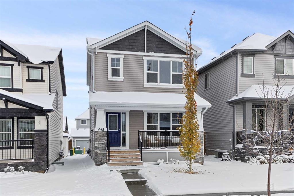 This is the one you have been waiting for! This stunning 3 bedroom home is loaded with upgrades and features a separate side entrance to the basement. Starting with the cozy front porch, the perfect spot to unwind after a long day and watch the sunset. As you enter the open concept main floor you are greeted by the luxury vinyl plank flooring throughout. Spacious front living room with large picture window flooding the property with natural light and a show home worthy feature wall. Chef's dream kitchen with crisp white cabinetry, gold hardware and pulls, subway tile backsplash, quartz counters, upgraded black stainless steel appliances with gas range, and a large center island. Open to the dining area and back door leading to the yard with concrete parking pad. The 2-piece powder room and a separate side entrance to the basement complete this well appointed main floor. Head upstairs to the primary suite with walk-in closet and large spa-like ensuite with double sinks, quartz counters, soaker tub, and separate glass shower. Additional good-sized 2nd and 3rd bedrooms, another full 4-piece bathroom, and upper floor laundry complete this well laid out upper floor. All this located in one of Airdrie's newer and most sought after communities, walking distance to schools, parks, playgrounds, walking paths, shopping and quick access to Calgary. This home shows 10/10 and is a must see!
