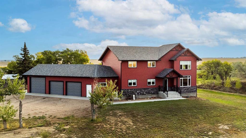 Welcome home to a sprawling 13-acre property, boasting a pristine new build completed in 2021. This spacious residence spans over 2600 square feet and offers five bedrooms, three bathrooms, and a quad attached heated garage, providing both comfort and convenience. The home exudes a sense of openness with 9ft ceilings throughout the main, 18 foot high ceilings in the living room and oversized windows that flood the entire space with natural light. The heart of this home is a kitchen adorned with dark maple cabinets, a full stainless appliance package, and elegant quartz countertops. The adjacent dining area seamlessly flows onto a huge covered deck, offering a perfect vantage point to enjoy the serenity of the property. The landscape is a picturesque haven with mature trees and a dugout stocked with trout. The primary bedroom on the main, features a walk-in closet and 4-piece ensuite. The main floor also hosts a versatile second bedroom currently utilized as an office space. The practicality of the home is highlighted by a spacious laundry room with a sink conveniently located off the garage. Venture upstairs to discover a large family room and three more generously sized bedrooms, accompanied by a 4-piece bath. Each room on the top floor enjoys individual heat pump control units, ensuring personalized comfort for every member of the household. Practical amenities include an oversized cistern (4297 gallons) connected to wifi for easy monitoring, a new septic field, and yard water supplied from the on-site dugout. The property is a great match for equestrian enthusiasts & animal lovers, offering ample space and featuring a second dugout on the southeast corner. Situated only minutes from town down the 41a, this property seamlessly blends rural tranquility with urban accessibility. Take a 24-hour virtual tour to experience the allure of this property, welcome home.