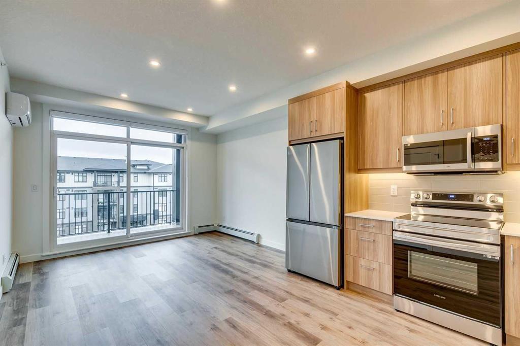 This brand new "never-lived-in" TOP FLOOR 2 bedroom unit in desirable Seton West development comes with $15,000 in upgrades and NO GST. Prime location close to amenities, transit, South Health Campus Hospital, YMCA, shopping and much more. Titled underground parking stall with storage unit. Stunning top floor unit with sunny west exposure and large balcony with gas hook-up. Nice open plan with high ceilings and vinyl plank flooring. Bright eat-in kitchen features quartz counters, stainless appliances, and plenty of cupboard and counter space. Open living room area with patio doors to large west balcony. Functional design with 2 bedrooms, 4-piece bathroom and in-suite laundry with stack-up washer/dryer. Features and upgrades include: air conditioning unit, advanced ventilation system, upgraded blinds, under cabinet lighting, floor-to-ceiling kitchen cabinets, 9 ft. ceilings, vinyl plank flooring throughout (no carpet), quartz counters in kitchen and bathroom, LED pot lighting, gas outlet on balcony, upgraded appliances including full size stack-up washer/dryer. Titled underground parking stall. New Home Warranty. "Curnoe 2" floor plan. Note: Floor plan sketch in photos reflects builder estimated size (577 sq. ft.). Immediate possession.