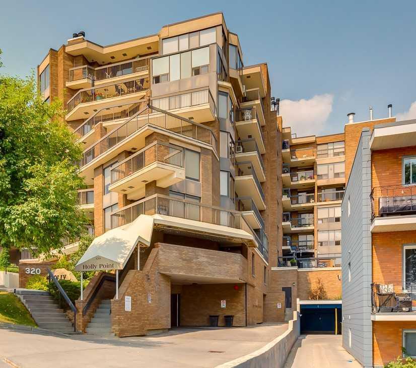 Inner city living at its best! With just under 1700 square feet of completely updated urban comfort, this open concept 2-bedroom, 2-bath unit has sweeping city and river views. The entire unit had been freshly painted, with brand new luxury plank flooring, new vanities in the spa like bathrooms and a glorious soaker tub in the ensuite. Imagine evenings in front of your wood burning fireplace or gathering with friends around the extended kitchen island with granite counter tops. Holly Point is an iconic Calgary concrete building that has been meticulously upgraded and maintained. The parkades have just had all concrete work completed and the front entrance canopy redesign and construction is underway. There is a well-equipped and recently updated gym, a warm and inviting party room with a pool table and lounge area, and underground parking that includes four visitor stalls. Imagine walking to Bridgeland for lunch, to Blush Lane for some snacks or to downtown for work or entertainment. Right outside is Calgary’s extensive river pathway system, and up the hill is Rotary Park, tennis and a toddler water park.