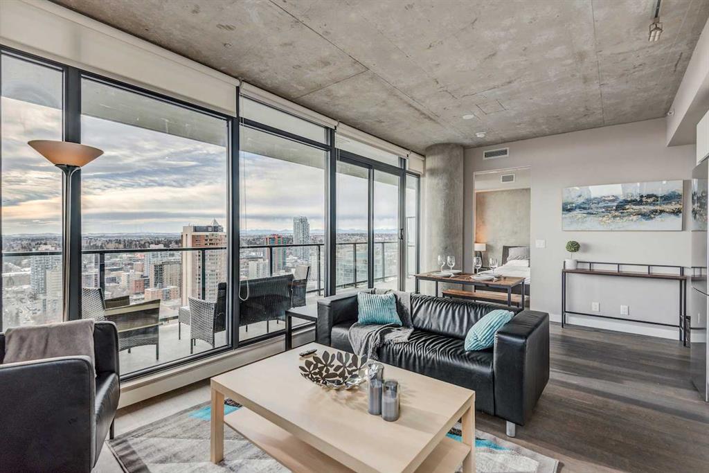 Welcome to urban living at its finest! This trendy 2 bedroom, 1 bathroom high rise condo is nestled right in the heart of the vibrant downtown Calgary scene, making it a great place to live or rent out as a short-term or long-term rental. With its modern design featuring concrete finishes, expansive windows, and a private balcony, this condo is the epitome of city living. Don't miss out on the sleek kitchen that boasts modern appliances, ample counter space for cooking and entertaining with vast views of the downtown area. The spacious open-concept living area is flooded with natural light from the large south and east windows, creating a bright and inviting atmosphere. In this beautiful open concept space you can easily move between your kitchen and living area. After a long day of work, curl up on your sofa and watch TV or step out onto your extra large private balcony and soak in the breathtaking city and mountain views. Both bedrooms provide you with space for Queen size beds and ample sized closets. The bathroom is beautifully designed with contemporary fixtures and a sleek aesthetic. Living in this luxurious space will provide you with all the amenities you could dream of plus more. You will have full access to the fitness center, rooftop terrace, outdoor pool, common room for entertaining large crowds, secure parking, on-site Concierge and 24 hour security and more! Located in the heart of downtown, you're within walking distance to trendy restaurants such as Ten Foot Henry, Bridgette Bar, National on 10th, Craft, grocery and retail shopping, cultural attractions, and public transportation. Don't miss out on the opportunity to make this chic downtown condo your urban oasis. Contact us today to schedule a viewing and experience the best of city living!