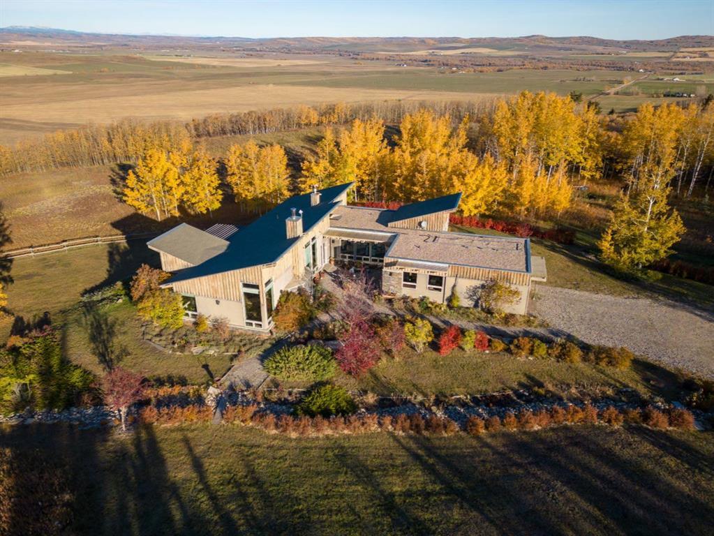 Built in harmony with the natural landscape, this home will awaken your inner artist with the incredible beauty of nature streaming through the windows bringing the majesty of Alberta’s outdoors, indoors. ~CLICK ON THE MOVIE REEL FOR A TOUR~ If you have been searching for a very quiet and private restful respite to relax, ponder and create you have found it. This home is architecturally designed based on a Dutch heritage home to invoke serenity, peace, simplicity, light and beauty with practical functionality. You’ll be immediately immersed in a living space that excites the soul. Begin with the European-styled rock and stone courtyard that invites you inside through the handsomely designed craftsman entrance door with stained glass accents. From the front door you are guided through a stunning gallery hallway across from a wall of perfectly placed windows. A few steps beyond the the great room and it is indeed GREAT, with unparalleled stunning views of the Rocky Mountains. This incredible living area is designed to be able to create different spaces within. Whether it’s to curl up with a book, play music or gather around the Inglenook fireplace hearth to complete a project while relaxing in the warmth with the crackle of the fire. This space can be transformed for a large gathering or a house concert. Every room has vaulted cathedral ceilings and floor to ceiling windows, all with splendid views. The primary suite is incredibly inviting with wool carpets, a spacious smartly designed walk-in closet with a window and a large ensuite with a rain shower. Two more spacious and comfortable bedrooms, both with tremendous mountain views complete this layout. This home is built on a single level with upscale continuous tile and in-floor heating throughout. The landscaped gardens are made up of mostly native, deer and drought resistant plants which follow the natural contours of the land. A peaceful rest will come over you each evening as you listen to the owls or watch the snow falling softly around you. Stroll along the many pathways carved through the groves of aspen and spruce trees. Grow a bountiful harvest in the fenced garden that was at one time, a corral and sheep enclosure. Enjoy the private orchard complete with mature pear trees, raspberry and haskap bushes. In the summer months, tall sunflowers and vines grow beside the west deck, creating a very cheerful and uplifting space. A large quonset provides plenty of storage and shop space. The attached, oversized garage with in-floor heat will accommodate your vehicles with room to spare. As you drive up the road leading to the property, you will be tempted to pull over, take a deep breath and marvel at the views, but don’t stop there because the best is yet to come.. This home is wheelchair friendly and less than an hour from the International airport.