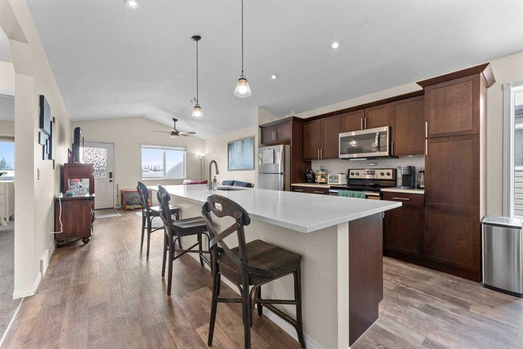 **Open House Cancelled** IRRICANA is a quaint town only 15 minutes from Airdrie and 30 minutes from Calgary. This beautiful home is situated on a quiet street and BACKING ONTO GREEN SPACE - it is IMMACULATE and APPEARS NEW! It features 3 bedrooms, 2 bathrooms, an OPEN floor plan, DOUBLE DETACHED GARAGE, and is tastefully landscaped and fenced! The main floor of this home features soaring VAULTED ceilings and an OPEN FLOOR PLAN. The interior has been FRESHLY PAINTED and the kitchen was UPDATED with gorgeous WHITE QUARTZ countertops, backsplash and an amazing large quartz island that can seat 8-10! There is still plenty of space for a family sized dining table with a hutch etc.! The expansive living room has access to the beautiful COVERED DECK. The vaulted ceilings and SUBSTANTIAL windows allow for an abundance of NATURAL LIGHT. Custom window coverings are newer. On this floor there are two spacious bedrooms - one that was designed as a master bedroom with plenty of room for a king sized bed and features a walk-in closet. Both bedrooms and hallway have new carpet and share a 4pc bathroom. The lower level has recently been developed with gorgeous LUXURY VINYL PLANK flooring. The enormous family room features an electric FIREPLACE with CUSTOM WOOD MANTLE and wall mounted TV. The lower level MASTER SUITE is enormous and the large windows allow for plenty of natural light! A cozy sitting area completes this space! There is a large walk-through closet on the way to the 4pc ensuite bathroom. The bathroom can also be accessed from the family room. The laundry room and storage spaces complete the lower level. The back yard has been BEAUTIFULLY LANDSCAPED with grassed area, garden beds and 2 decks. There is access to the deck from the living room - the COVERED DECK has a privacy screen for your enjoyment! There is a gas line for your BBQ as well as patio lighting making it a wonderful outdoor space. A second deck is built by the garage. The garage was recently completed and fully insulated with a gas line ready for heat should you choose! The lot is well proportioned with room to enjoy, room for children to play, room for some gardening, and room to entertain. Behind this home is an open field, an off-leash dog park, outdoor skating area and great walking areas! This lot is a great size and perfect for the growing family or empty nester!