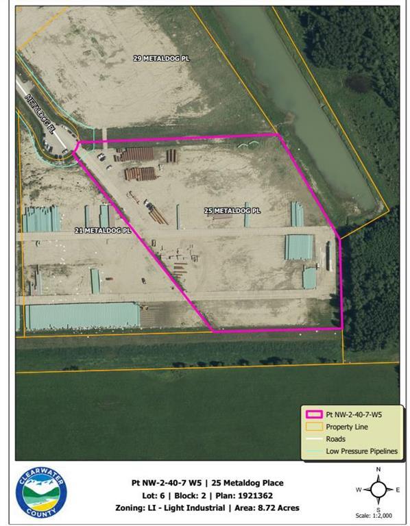 25 METALDOG PLACE 8.72 ACRES - Metaldog Industrial Subdivision is located minutes northeast of Rocky Mountain House on Airport Road, situated on a ban-free road, and located within a mile of Alberta's High Load Corridor. Zoned LIGHT INDUSTRIAL DISTRICT “LI” Metaldog Industrial Subdivision is 1 of the newest industrial subdivisions within Clearwater County (has been used for a pipe laydown yard for the past couple of years). All bare lots are serviced with 3 PHASE power and natural gas to property lines, and all roads within the subdivision are paved, (Note: private well & sewer systems will need to be installed at the purchaser's expense to suit individual requirements). Firepond is located within the subdivision. Prime location to establish, and grow your business. Immediate possession is available. The general purpose of this district is to accommodate and regulate small to medium-scale industrial operations, note a security suite as part of the main building is permitted as a discretionary use (this allows for an owner/operator or staff to live onsite for security purposes, and is at the discretion of the development officer). No development timeframes. Make your mark in CENTRAL ALBERTA! Multiple lots available for sale, parcel sizes between 3.83 acres - 8.72 acres (GST is applicable)