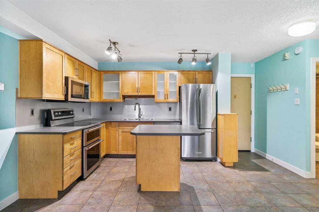 Step into this stylish and move-in-ready condo located just 3 blocks from the vibrant 17th Avenue and 4th Street, known for its diverse dining options, trendy shops and thriving urban culture. This is a cozy and bright 1 bedroom 1 bathroom apartment with a massive double balcony, a storage locker, and bicycle storage in a pet-friendly building. This unit is situated within a well-kept concrete building on a tree-lined street, showcasing a modern open floor plan. The spacious kitchen is a chef's dream, with solid maple cabinetry, newer Kitchen Aid appliances, and a new LG dishwasher. The double oven is a fantastic addition for those who love to cook. The kitchen island and sleek backsplash add to the contemporary aesthetic, and there's ample cabinet and counter space for all your culinary needs. The open floor plan also ensures a smooth transition from the well-appointed kitchen to the living room, creating a seamless and inviting living space. The living room has been updated with vinyl plank flooring and is filled with natural light, making it a welcoming space to relax and unwind. Step out onto the large double balcony to enjoy stunning views of downtown, perfect for evening drinks and soaking in the cityscape. The good-sized bedroom has a closet and balcony access, providing a comfortable retreat. The bathroom features elegant ceramic tile and a deep soaking tub, ideal for relaxing after a long day. The unit completes in-suite laundry. You'll have the convenience of a partially covered parking stall and additional visitor parking. The low condo fees cover heating and water/sewer, making this an affordable place to call home. This investor-friendly building allows for short-term rentals and is a quiet, adult-only 21+, ensuring a peaceful living environment. The Beltline offers easy access to public transportation, bike lanes, and walking paths, making it an eco-friendly and convenient hub for navigating the city. Don't miss this incredible opportunity to experience city living at its best – book your viewing now!