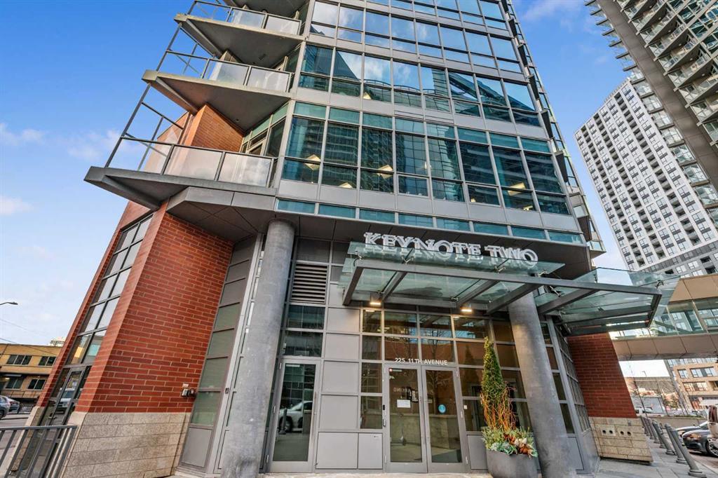 Keynote 2 - one of Calgary’s premier apartment residences, offering maintenance free, amenity rich, urban living steps from all that downtown Calgary has to offer! This executive, 14th floor, southeast facing 1 bedroom end unit truly shines with endless natural light, AC and floor to ceiling windows with amazing panoramic views from every room! Stylish kitchen features full height cabinets, granite counters, stainless steel appliances & centre island, perfect for informal dining. The adjoining living room can ccommodate full-size furniture and leads out to the balcony where you can enjoy your morning coffee while watching the sun rise, the big city lights and stampede fireworks! Flex space off the kitchen can be used as a formal dining area or office space. Generous bedroom features a walk-through closet & cheater door to the 4 piece bathroom with an extended vanity cabinet and tile flooring. This unit also offers the convenience of in-suite laundry, one heated underground titled parking stall and an enclosed & secure titled storage locker. A truly unique development, residents of Keynote II enjoy a plethora of amenities including two guest suites, two fully equipped gyms, an owner’s lounge, jetted hot tub, 2 secure bike storage rooms located on P1/P2, and a rooftop oasis designed for entertaining with lush greenery, a variety of seating choices and a communal BBQ area. Attached to the building you’ll find Sunterra Market Grocery and 5 Vines Wine. Conveniently located in the heart of the Beltline, you are steps away from fine casual dining, shops, vibrant 17th Ave, Stephen Ave, the Bow River and Stampede Grounds... Don’t miss this opportunity to live a "lock & leave" lifestyle in luxury!