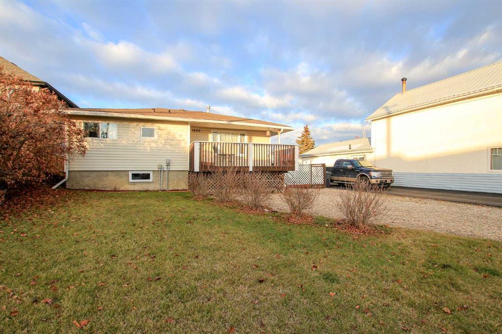 FULLY DEVELOPED 4 BED, 2 BATH RAISED BUNGALOW ~ LOCATED ON A LARGE LOT WITH MATURE LANDSCAPING ~ STEPS TO DODD'S LAKE ~ Pride of ownership is evident in this well cared for home with many upgrades over the years ~ A large partially covered deck with enclosed storage below welcomes you ~ The living room is a generous size with a large south facing window offering tons of natural light and opens to the dining room where you can easily host a large family gathering ~ The kitchen has a functional layout with tons of white cabinets, ample counter space including an island with butcher block and easy access to the mud room with access to the patio and backyard, that also serves as a separate entrance to the basement ~ The primary bedroom can easily accommodate a king bed and has dual closets ~ 2 more bedrooms and a 4 piece bath complete the upper level ~ The fully finished basement with vinyl plank flooring offers a family room, 4th bedroom, oversized 3 piece bathroom with a large linen closet and an awesome laundry room with an abundance of cabinets and counter space, a sink and a second (full size) fridge ~ Crawl space offers additional storage ~ The fully fenced backyard is landscaped with mature trees, shrubs and perennials, has a garden shed, large garden plot, fire pit area and a stone patio ~ Located on a quiet street just steps to the beautiful Dodd's Lake with walking trails and year round outdoor activities, close to schools, playgrounds and many restaurants, shopping and all other amenities downtown Innisfail offers ~ Front driveway has room for multiple vehicles and/or your RV.