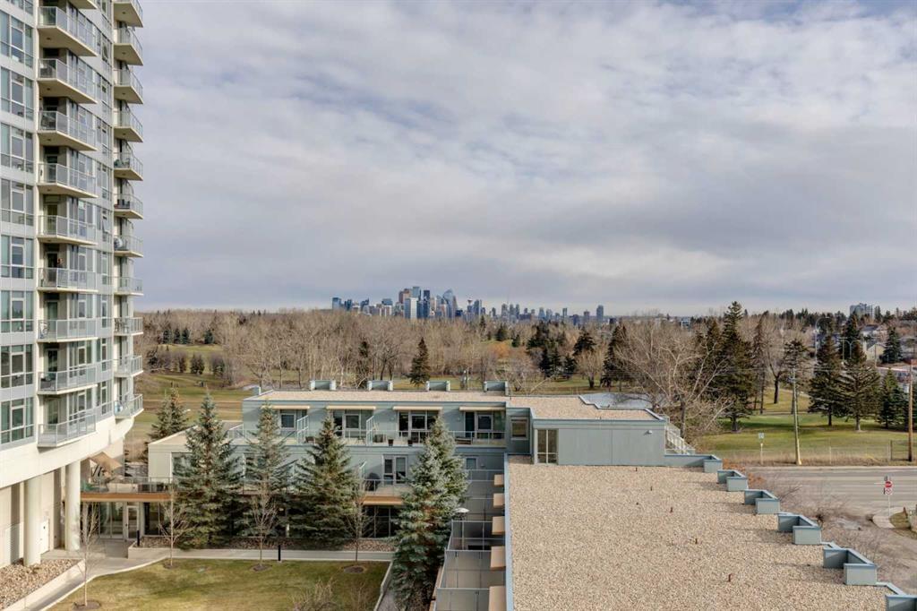 Full unobstructed downtown skyline and golf course views from this nearly 1000 square foot 2 bed 2 bath upgraded unit in Encore! New luxury vinyl plank flooring in the living room, hallways, and bedrooms. Gorgeous open kitchen with stainless steel appliances, flat top stove, granite countertops & backsplash, large island, under cabinet lighting, and tons of cabinets. Living room with 9 foot tall ceilings, corner gas fireplace and large balcony. Master bedroom has a huge walk in closet, full ensuite with extended granite countertops and tile flooring. The second bathroom has a wonderful sliding glass door shower with tile and granite. Upgraded front loading washing and dryer. Central air conditioning, underground parking, and storage locker. Complex has amazing amenities including a pool, hot tub, and gym. Across the street from shopping and transit.