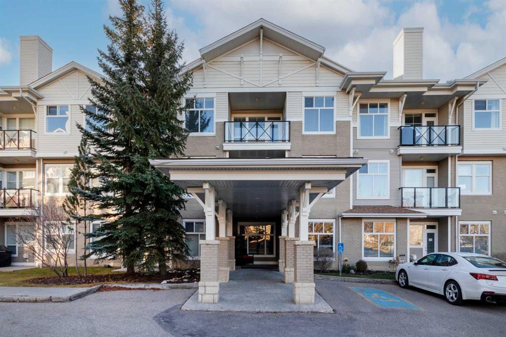 Amazing mountain views from this top floor corner condo with 2 bedrooms, 2 bathrooms plus a den! This extremely well kept, very bright, updated condo features 1341 sq ft of well laid out space, and is an ideal spot for someone looking to downsize from their large family home or for the person looking for a larger than average condo. The spacious kitchen offers updated quartz countertops & updated sink/faucet, plenty of full height cabinets, a pantry, and updated stainless steel appliances (all appliances within the last 3 years). The kitchen opens onto the dining area and onto the living room which has large windows, a gas fireplace and vaulted ceiling. The spacious primary bedroom has room for king size bed plus furniture, has a large walk-in closet, and an ensuite with updated walk-in shower, toilet and quartz countertop. The second bedroom is located on the other side of the condo providing great privacy between the bedrooms, and has a 4-piece full bathroom beside. The large den is a great flex space to be used as an office, TV room or guest room (no window). Hardwood floors and ceramic tile throughout the living space, along with knockdown ceilings and crown moulding throughout. In-suite laundry with storage, huge corner balcony with BBQ gas line, titled underground parking, and an assigned storage locker complete this amazing condo. This well cared for complex has a common area social room with kitchen that can be booked for events, well manicured grounds with a feature rock garden and fountain, a guest suite available to rent, and many visitor parking spots. Great location, within walking distance to the community lake and quick access to the Crowfoot shopping centre and C-Train station.