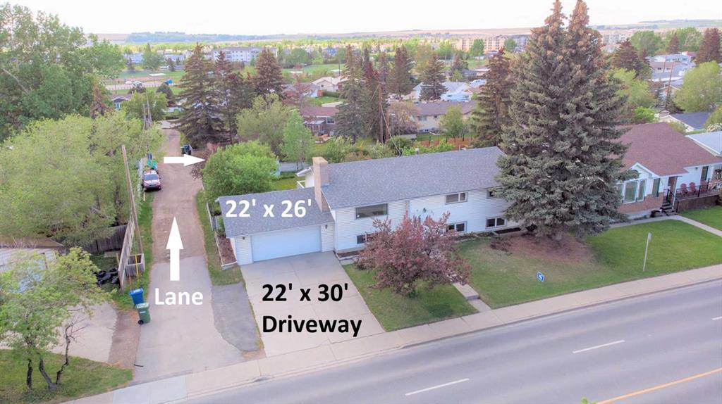 Lots this size are rarely available. 10,400 sq.ft. on Main Street Airdrie. Ideal for Investor/Landlord, Tradesman or Large Family. Lots of room for secondary garage (only 30% lot coverage currently). SIX bedrooms, 2,750+ sq.ft. fully developed bilevel with rear laneway on two sides. 84' x 125' west backing lot, a 22' x 26' attached garage (with man door to rear yard) and oversized 22' x 30' front driveway. The huge lot is fully fenced and there's gated rear lane access to the back yard. Main level features three bedrooms with one and a half baths, including the large primary bedroom (17' x 13' with 2 piece ensuite). The oversize kitchen (18' x 13'4") has room for dining or add an island, and comes with fridge, stove, hood fan (charcoal filter), new dishwasher, and access to the large 10' x 34' sunny west backing rear deck. Spacious living room (17'5" x 13'5") and flex room (dining or home office) also has rear deck access. The lower level is fully developed with three bedrooms including the main bedroom (13'6" x 10'6"), a three piece bath, large family room (16'6" x 13') with secondary home office area (13' x 10'), another home office, and mechanical room with washer and dryer. With laneway on two sides, there's great potential for secondary garage, ideal for tradesman and home business (by permit), and there's still lots of yard left over. Sunny south and west exposure and fire pit. Dishwasher is new, and 2022 shingles, HWT, carpet and paint, and six new windows have been installed. Some updating needed, but taken into account in the pricing, with significant land value here. Ideal for investor or large or extended families, or people looking for some space and privacy. Walking distance to downtown, all levels of schools, Superstore and Canadian Tire. Realtor/Seller has an interest.