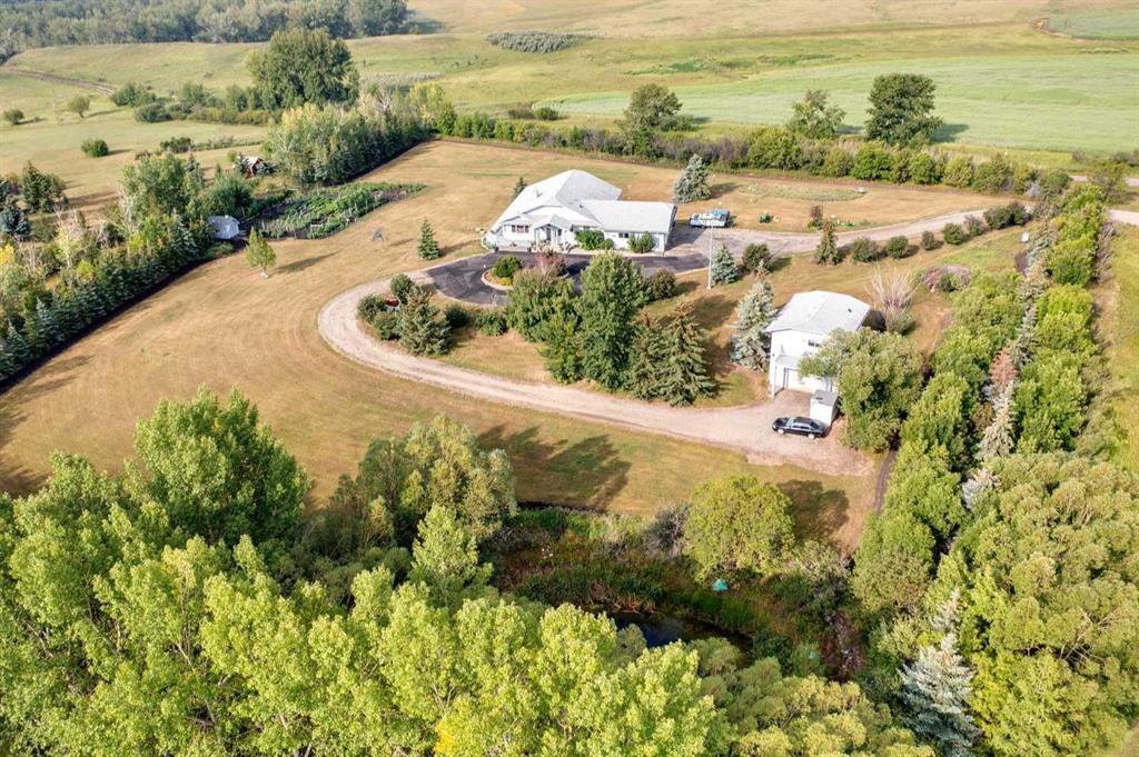 Do not miss this rare opportunity to experience the enjoyment of country living in an absolutely prime location, only 3 minutes drive to all the conveniences of Okotoks. Feast your eyes on the sweeping panoramic mountain and valley views from your own private paradise with parklike setting. This 4 acre property is beautifully landscaped with flower beds, shrubs and hundreds of mature trees, offering peace and serenity with a natural playground for wildlife and birds. For the gardening enthusiast, you will enjoy the large fenced vegetable garden. The custom built, fully developed walkout bungalow has been thoughtfully designed with over 3,100 sq. ft. of living space. Functional open floor plan with maple hardwood flooring throughout kitchen and living room, towering vaulted ceiling and tons of natural light from all directions. Outstanding gourmet kitchen featuring rich maple cabinets, breakfast bar, walk-through pantry, built-in oven, microwave and gas cooktop surrounded by brick alcove, and an abundance of cupboard and counter space. Adjoining dining area is wide open with plenty of space for large gatherings with garden door to massive wrap-around deck, ideal for outdoor entertaining. The open living room is flooded with natural light and west views. The primary master bedroom is spacious and features 4-piece ensuite with corner soaker tub, shower, and walk-in closet. Main floor den with built-in shelving is a must for home office needs. Main floor laundry/mud room with sink and cabinets and inside access to oversize triple attached garage. Two-piece powder room on main level. Attractive central staircase leads to the professionally developed lower walkout level featuring in-floor heating and large windows. Bright lower family/games room with attractive brick fireplace, ceramic tile flooring, wet bar, and garden door to west facing patio. Bedrooms 2 and 3 are a very good size with an abundance of closet space. Additional multi-purpose flex room, wine/cold room, and 4-piece bathroom with double sinks. Utility room offers additional storage space. Let's not forget the oversize double detached garage/shop for all your extra equipment and toys with upper illegal suite. This exceptional property really does offer the best of both worlds with country living at it's best!